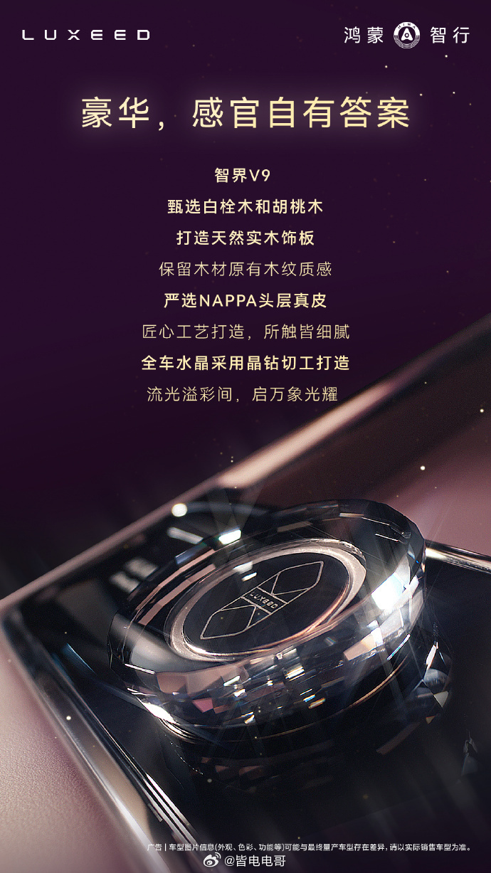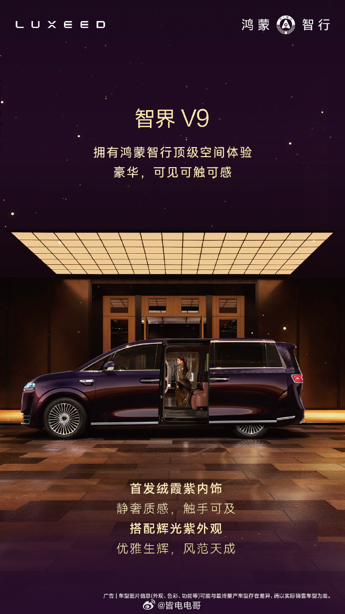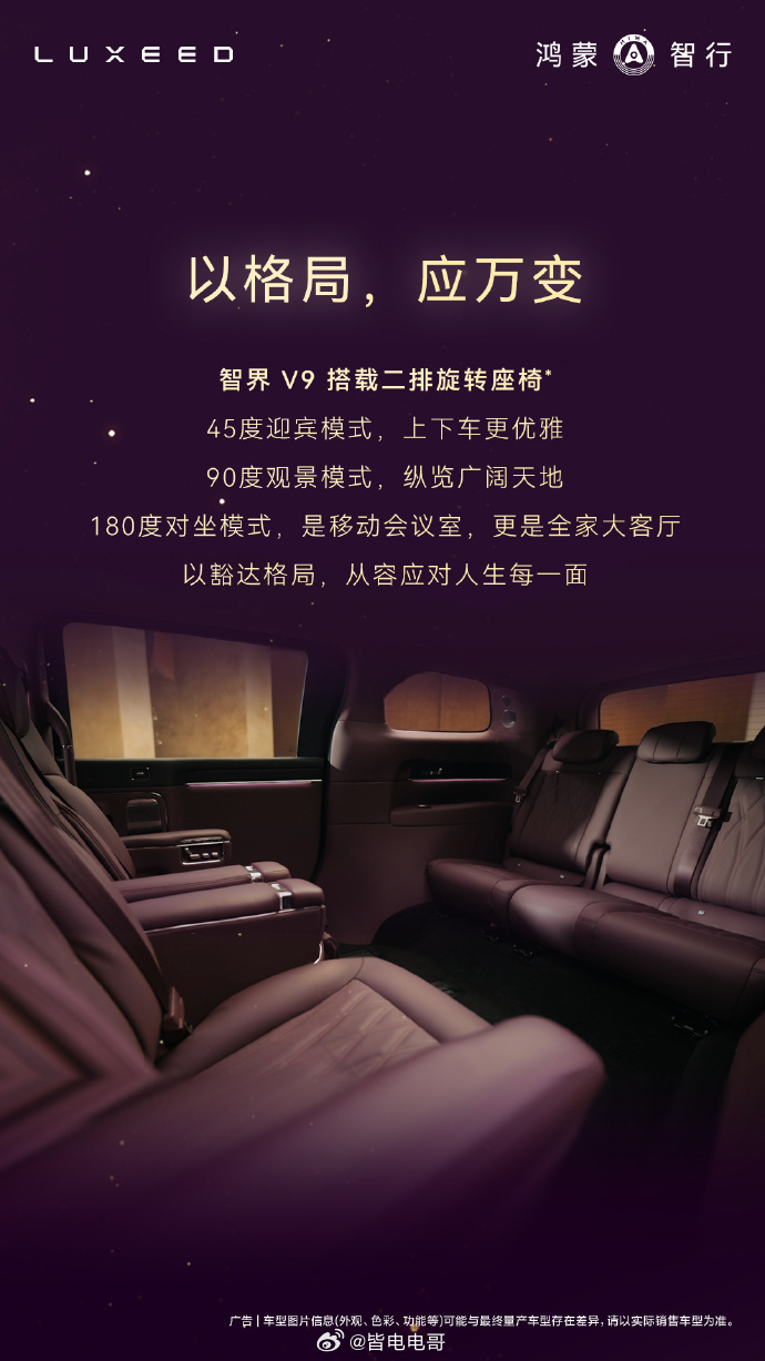 智界V9内饰图正式曝光了,是选用了绒霞紫的内饰配色二排旋转座椅、太空舒躺模式及零重力座椅模式等舒适性智能科技配置通通安排上。座舱内的工艺材质也不简单,使用了天然实木、NAPPA头层真皮与晶钻切工水晶等高端材质及工艺。