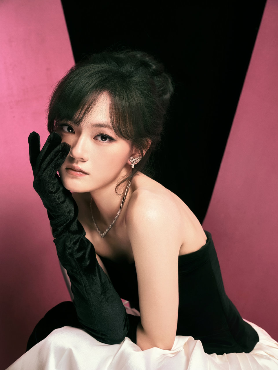 张凌赫一袭 GUCCI 2026春夏系列,丝绒深V,搭配BVLGARI灵蛇项链点