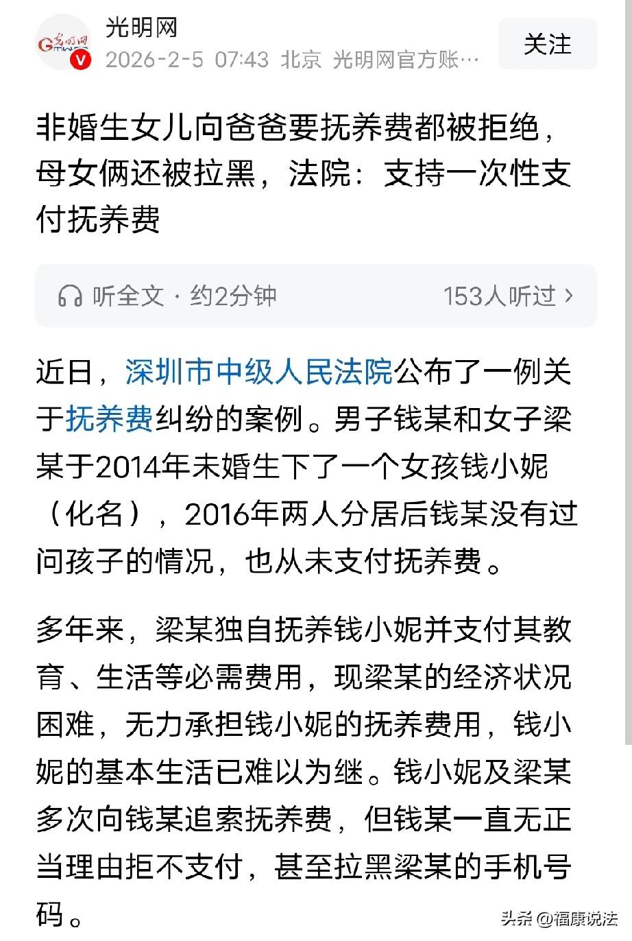 深圳,男子和女子未婚,却生下一女儿,2年后二人分居,男子从此不给女儿抚养费,还把女子拉黑,多年后,女子经济困难,强撑着抚养女儿,又得知男子病入肓膏,眼看着他名下有多处房产,却不支付女儿抚养费,便一纸诉状告上法院,要求男子一次性支付女儿抚养费到18周岁,法院判了。 钱先生和梁女士在一起恋爱后,头脑一热“稀里糊涂”地生下了一个粉雕玉琢的女儿,取名叫钱小妮(化名)。 本以为新生命的降临会让这个小家庭充满欢声笑语,可谁能想到,甜蜜的时光就像昙花一现,仅仅两年后两人就因为各种鸡毛蒜皮无法继续生活在一起了。 可自从分居之后,钱先生就像变了个人似的,对女儿钱小妮的情况不闻不问,仿佛这个女儿从来就不存在一样。 更过分的是,他连一分钱抚养费都没给,完全把抚养孩子的责任抛到了九霄云外,仿佛非婚生女儿不重要一样。 这么多年来,梁女士只能独自挑起抚养钱小妮的重担。她是又当爹又当妈,白天努力工作赚钱,晚上回家还要照顾女儿的生活起居,辅导女儿的功课。 她省吃俭用,把每一分钱都花在女儿身上,就盼着女儿能健康快乐地长大。 可一个人的力量终究是有限的,日子一天天过去,梁女士的经济状况越来越捉襟见肘,到了入不敷出的地步。 甚至,她连给女儿买件新衣服、报个兴趣班都成了奢望,无法保证女儿钱小妮的正常生活。 没办法,梁女士为了女儿只能一次次地厚着脸皮向钱某追索抚养费。 她们满心期待钱某能念及父女之情,回心转意,可钱某却像个“铁石心肠”的家伙,一直找各种莫名其妙的理由拒不支付。 最后,他甚至干出了拉黑梁女士联系方式这种缺德事儿,彻底断了母女俩的希望。梁某和钱小妮心急如焚,却又无可奈何,只能暗自垂泪。 梁女士发现而从2022年起,钱先生的健康状态每况愈下,身体越来越差,恐怕命不久矣。 她担心,钱先生的财产也有可能随时出现重大变化,这就意味着钱小妮以后的生活保障岌岌可危,可能会要不到抚养费。 因为,梁女士知道钱先生名下有多处房产,她也为此收集了证据,她觉得让他一次性支付女儿抚养费比较合适。 到了2023年,梁女士实在走投无路了,作为钱小妮的法定代理人,她一咬牙告上法院。 希望钱某一次性向钱小妮支付从2016年起直到孩子年满十八周岁为止的抚养费,好给孩子一个稳定的未来。 话说钱先生做法实在是冷漠无情。明明是他的孩子,就算他和梁女士感情破裂分居, 但他应该承担起做父亲的责任,血浓于水的亲情不该就此消散。 梁女士独自拉扯孩子多年,省吃俭用,其中的艰辛难以想象。而钱先生却对女儿不闻不问,拒付抚养费,还拉黑联系方式,这哪像个父亲该有的样子? 《民法典》第1071条,非婚生子女享有与婚生子女同等的权利,任何组织或者个人不得加以危害和歧视。 根据法律规定,钱先生作为不直接抚养非婚生子女的生父,应当负担未成年女儿的抚养费。 不过,法院考虑到现实情况,再加上钱先生在2018年到2020年委托弟弟给梁女士转账5次。所以,法院考虑到之后可能会去广东生活的可能,酌定钱小妮的抚养费为每月3000元。 另外,梁女士拿出钱先生名下有多处房产的证据。 法院也考虑到,钱先生病入肓膏已经不能自己定期给钱小妮抚养费了,所以,支持了钱小妮要求父亲一次性支付抚养费的诉求。 孩子成长需要父母的关爱与经济支持,哪怕对方是非婚生子女,就该承担起应尽的责任,给孩子一个温暖的成长环境。 你对此怎么看呢?
