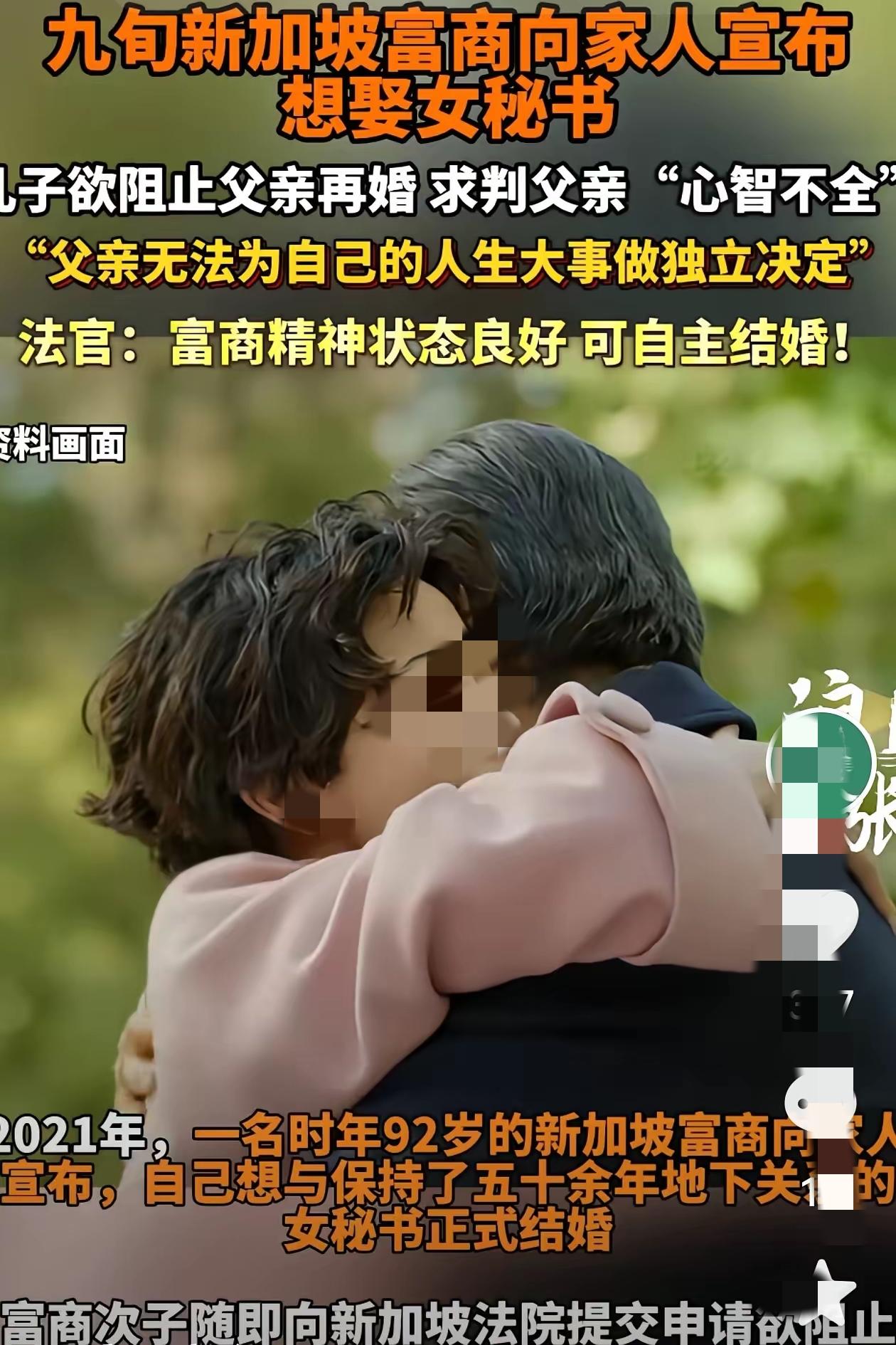 97岁富商要娶相伴52年女秘书,亲次子竟拿“老爹心智不全”把亲爹告上法庭,拦婚只为争家产,吃相真的不要太难看! 2021年富商92岁官宣再婚,次子当场拍桌翻脸,转头就递诉状,咬定父亲摔倒后脑子不清醒,没能力定婚事。可把富商老爹气得直呛,反手揭次子老底:你就是盯着家产,还反诉他挪公司钱、改遗嘱削其继承权,然后爷俩彻底撕破脸。 法院查了整整5年,医学评估实锤富商只是记性差、反应慢,婚事还是能摸的门儿清。还当场戳破次子双标行为:老爹升你当总经理时,咋不说他心智有问题?最终驳回诉求,次子还红着眼上诉,啧啧啧这嘴脸太难看了吧。 口口声声为老人好,实际揣着私心争家产 这心黑啊。现在的婚姻自由都受法律保护了,子女凭啥还拿“孝顺”当幌子,强插手长辈的人生选婚姻 择真的正确吗??对于这件事你怎么看?遗产 情感自由 嫁入豪门