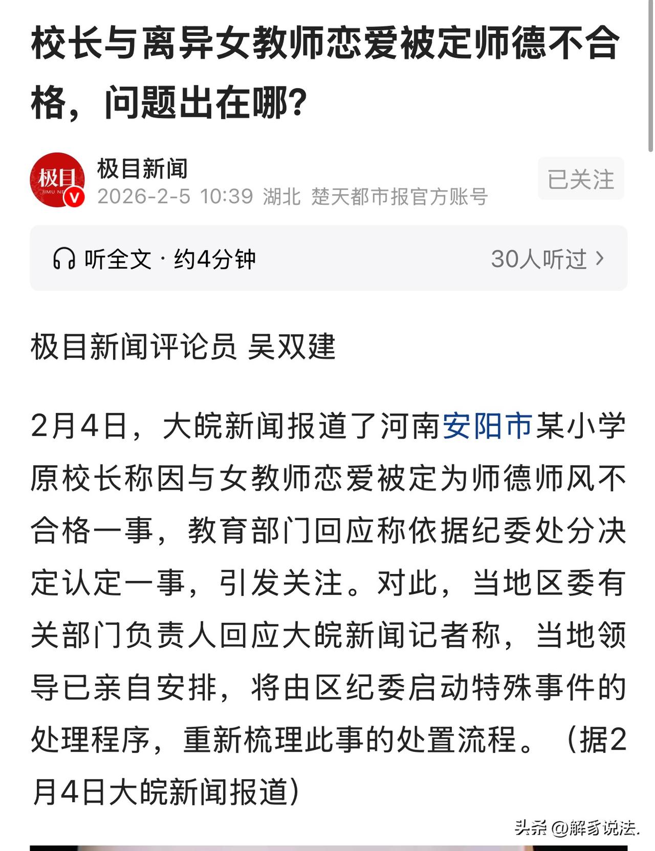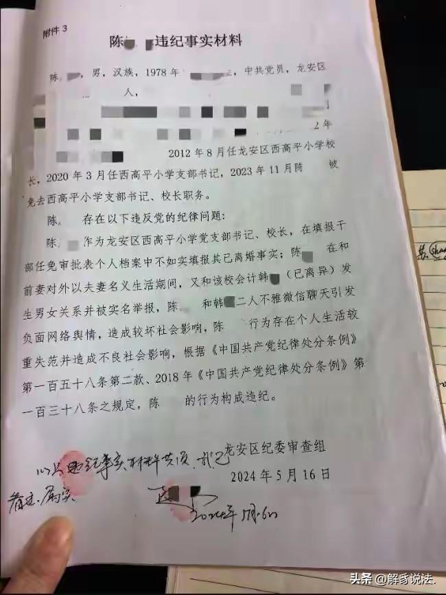 “冤吗?”河南安阳,校长和比其小15岁的女教师谈恋爱,女教师的丈夫知道后,气愤不已,直接把此事捅到相关部门。结果,校长不但影响了晋级,还被调离了岗位,女教师也被撸了职!校长喊冤枉,说自己和女教师恋爱期间,彼此都是离婚状态,有自己不得已的苦衷,才没对外公开。就在舆论向他这边倒的时候。有关部门透露,他和前妻以夫妻名义生活的时候,不仅和女教师恋爱,还和该校女会计不清不楚,脚踏两只船,这才是他不能公开的理由! 48岁的陈某,在一所小学任校长,年纪轻轻就坐上了校长一职,可见他一直很努力,也很上进,且未来有晋升的机会,前途一片光明。 然而就因为一件作风上的事,让其前途尽毁,名声扫地,为此,他大喊冤枉。 事情要从2011年10月说起,他和前妻婚姻走到了婚姻的尽头,办理了离婚手续。 离婚后,他一直单身,全身心投入到工作中,没再考虑个人问题。 然而,缘分到的时候,挡也挡不住。 2023年6月,陈某对本校女教师韩某有了好感,对方比其小15岁,年轻漂亮,性格温柔,彼时韩某处于离婚状态,陈某对韩某展开了强烈的追求,很快二人确定了恋爱关系,但由于特殊原因,二人没有公开恋情。 这也是后面导致二人身败名裂的导火索。 韩某的丈夫周某听说,她已经开启了新的感情,心有不甘,甚至怀疑,妻子在婚内就和陈某勾搭上了,这才是导致他们婚姻破裂的主要原因。 于是,他产生报复心理,将聊天记录等证据,发布到了网上,一不做二不休,又将此事捅到相关部门。 这下,周某如愿以偿了,陈某因师德师风问题,导致晋级无望了,还被调离了原岗位,韩某也被撸了职。 陈某知道周某在背后整自己,气愤不已,直接报了警,周某被警方拘留了。 眼看着前途尽毁,陈某没有反省自己的行为,而是将自己的冤情昭告天下,以上内容就是陈某口中的事实。 此事一曝光,舆论一边倒,都认为陈某和韩某在恋爱阶段,都是离婚的状态,不存在师德师风的问题,恋爱自由。 也有部份人认为,是否涉及师德应该用实际衡量,不应简单粗暴地用程序判断,但是校长和教师的确不适合在同一学校,毕竟校长算是掌握学校权力分配的核心人物,难免让人怀疑是否能做到公平,不应用师德有亏处罚,但应该平调老师或者校长到其他学校。 就在网友炸锅的时候,有关部门的调查结果,让陈某啪啪打脸。 有关部门透露,他与陈某恋爱期间,还在跟前妻以夫妻名义生活,同时他又和本校女会计不清不楚,就因为他脚踏两只船,才没法对外公开。 还有陈某在填干部档案的时候,压根没说自己离婚的事儿! 事情到这里就有点扑朔迷离了,真相究竟如何,目前还难有定论。 不妨多些耐心,让子弹再飞一会儿,不必急于下判断。 毕竟清者自清,浊者自浊。相信公道自在人心,既不会冤枉一个清白之人,也绝不会让有违规矩、有失底线者逍遥自在。