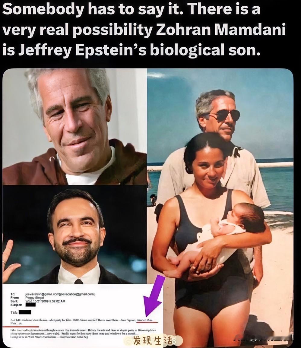 爱泼斯坦档案又爆出大瓜!纽约新市长扎赫兰·马姆达尼竟被指是爱泼斯坦的亲生儿子?!其母亲米拉·奈尔曾现身爱泼斯坦核心社交圈的派对,网传马姆达尼儿时与爱泼斯坦、克林顿的同框照曝光,他的长相还被热议与爱泼斯坦极为相似,多重线索让这一传闻瞬间引爆美国。 是无稽之谈的巧合,还是牵扯更深层的惊天阴谋?全美民众都在热议这场扑朔迷离的身份疑云。