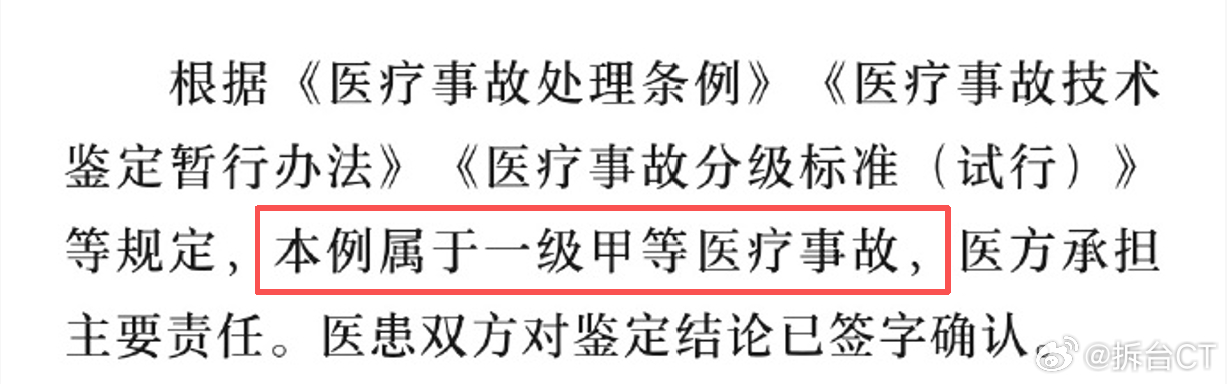 通报先前还提及,“根据《医疗事故处理条例》《医疗事故技术鉴定暂行办法》《医疗事故分级标准(试行)》等规定,本例属于一级甲等医疗事故,医方承担主要责任。”