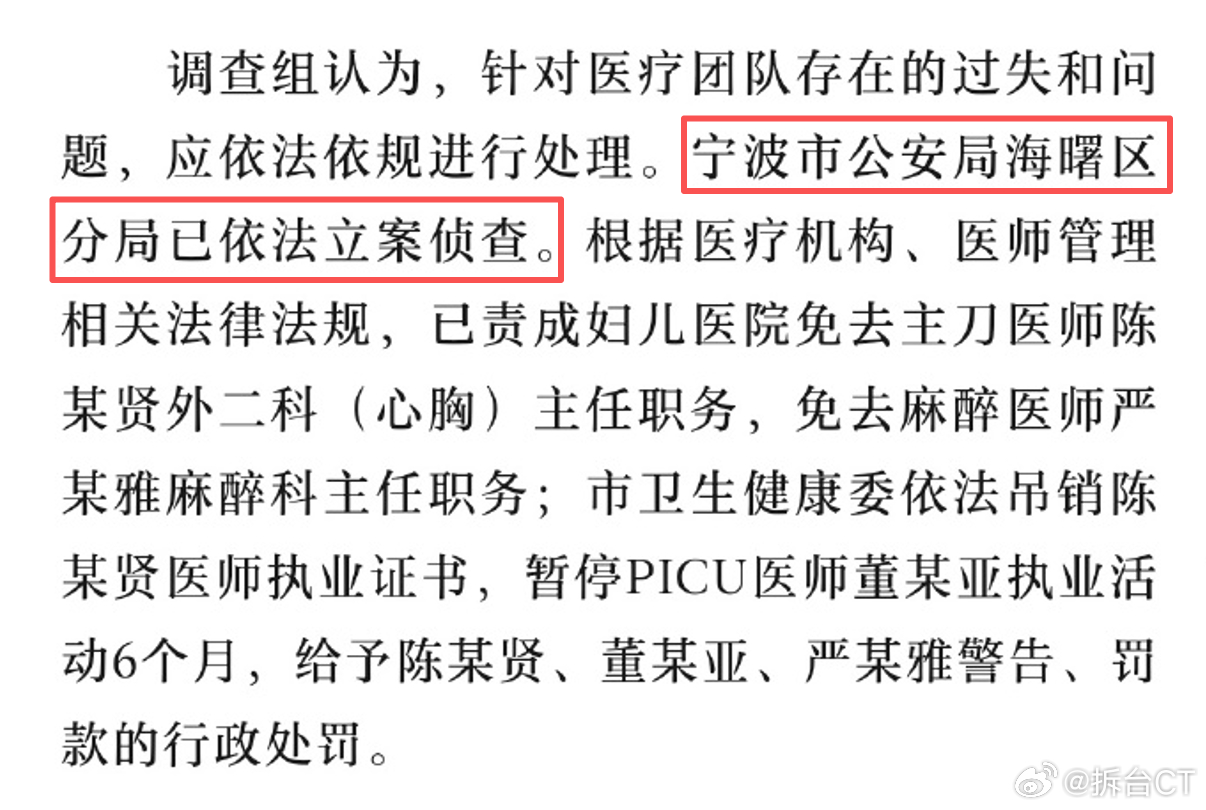 在第三部分的处理情况中,开头即表示,“调查组认为,针对医疗团队存在的过失和问题,应依法依规进行处理,【宁波公安海曙区分局已依法立案侦查】。”