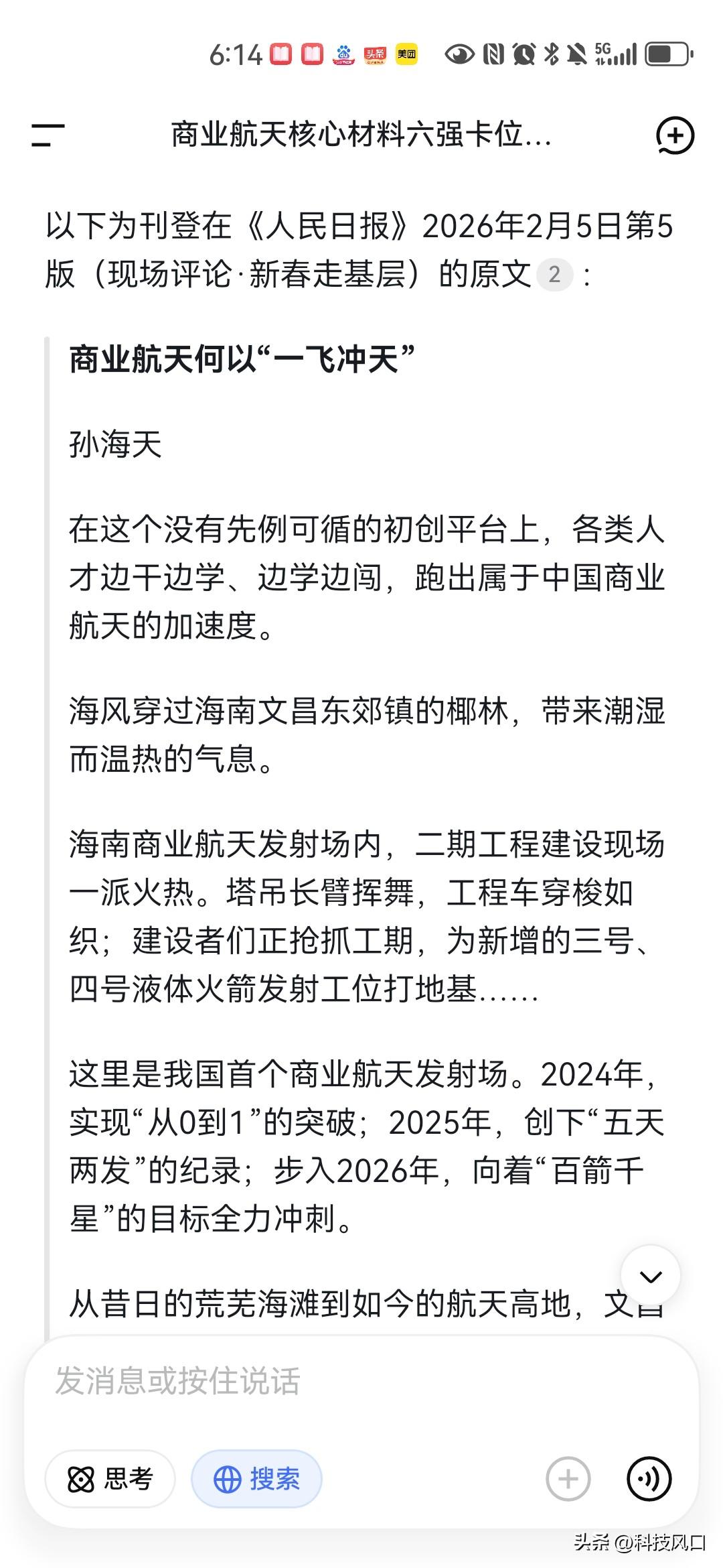 《人民日报》文章《商业航天何以“一飞冲天”》明确释放利好信号,核心观点是商业航天已进入国家支持、产业集聚的规模化发展快车道。 核心利好体现在: 1. 国家战略定调:文章在要闻版发布,标志着商业航天作为“新质生产力”获得国家层面确认,为行业发展提供了最强政策背书。 2. 模式突破降本:通过建设通用发射工位、采用“水平测发”模式,将发射准备时间压缩至3天。这解决了“发射难、发射贵”的核心瓶颈,是基础设施革命。 3. 产业集聚成链:发射场正从单一节点升级为“太空物流中心”,吸引火箭、卫星全产业链集聚,形成“前店后厂”的产业集群生态。 4. 政策红利独特:依托海南自贸港的零关税、税收优惠等政策,为商业航天公司提供了极具竞争力的运营环境。 对市场的影响: 这为投资划出了清晰主线。最直接利好发射服务与基础设施建设,其次是受益于产业集聚的火箭与卫星制造,以及未来“航天+”带来的数据应用服务。文章预示行业将从技术验证迈向产业化爆发,确定性显著增强。