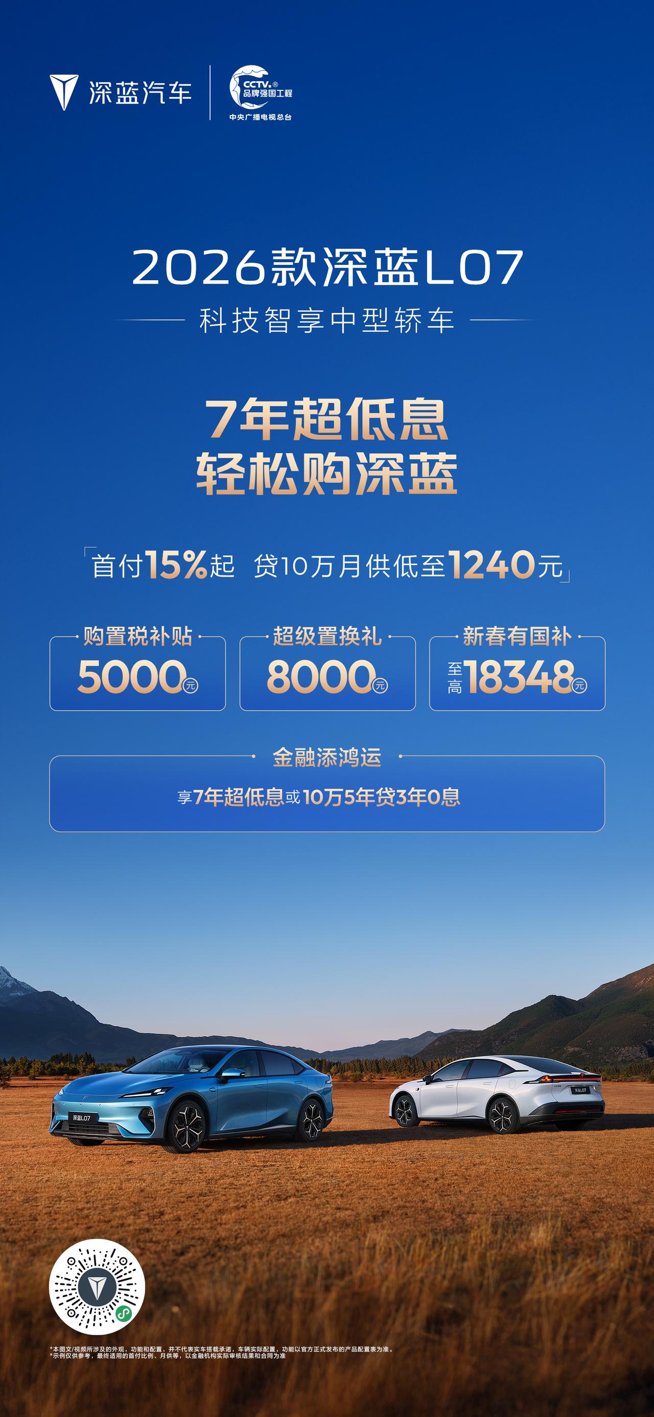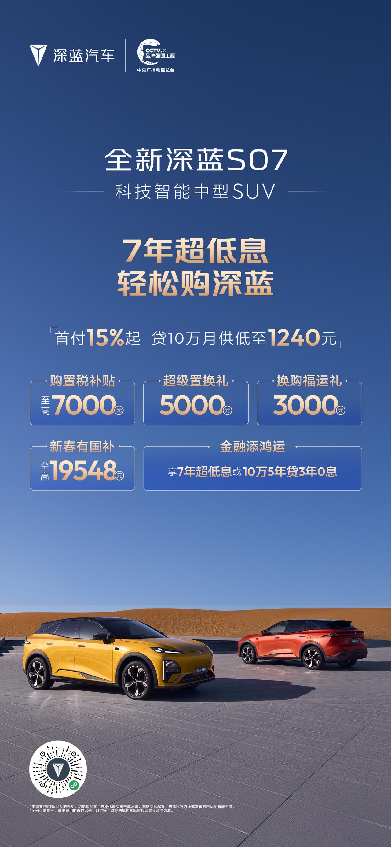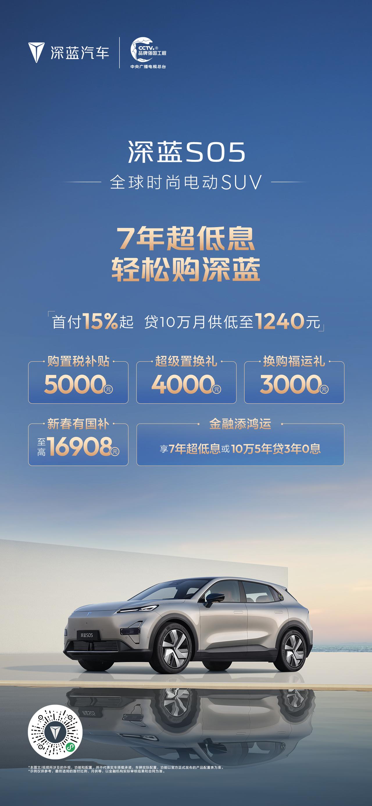 深蓝汽车新春推出“7年超低息 轻松购深蓝”专属金融政策,降低用户购车门槛,助力消费者轻松开起新年旅程。消费者可享“首付15%起月供低至1240元”的7年超低息方案,轻松拥有长续航座驾。同时,活动叠加多重限时礼遇:包括至高10000元购置税补贴、20000元新春国补红包及10000元换购福运礼,以极具诚意的金融方案与全方位补贴,守护每一段安心出行。