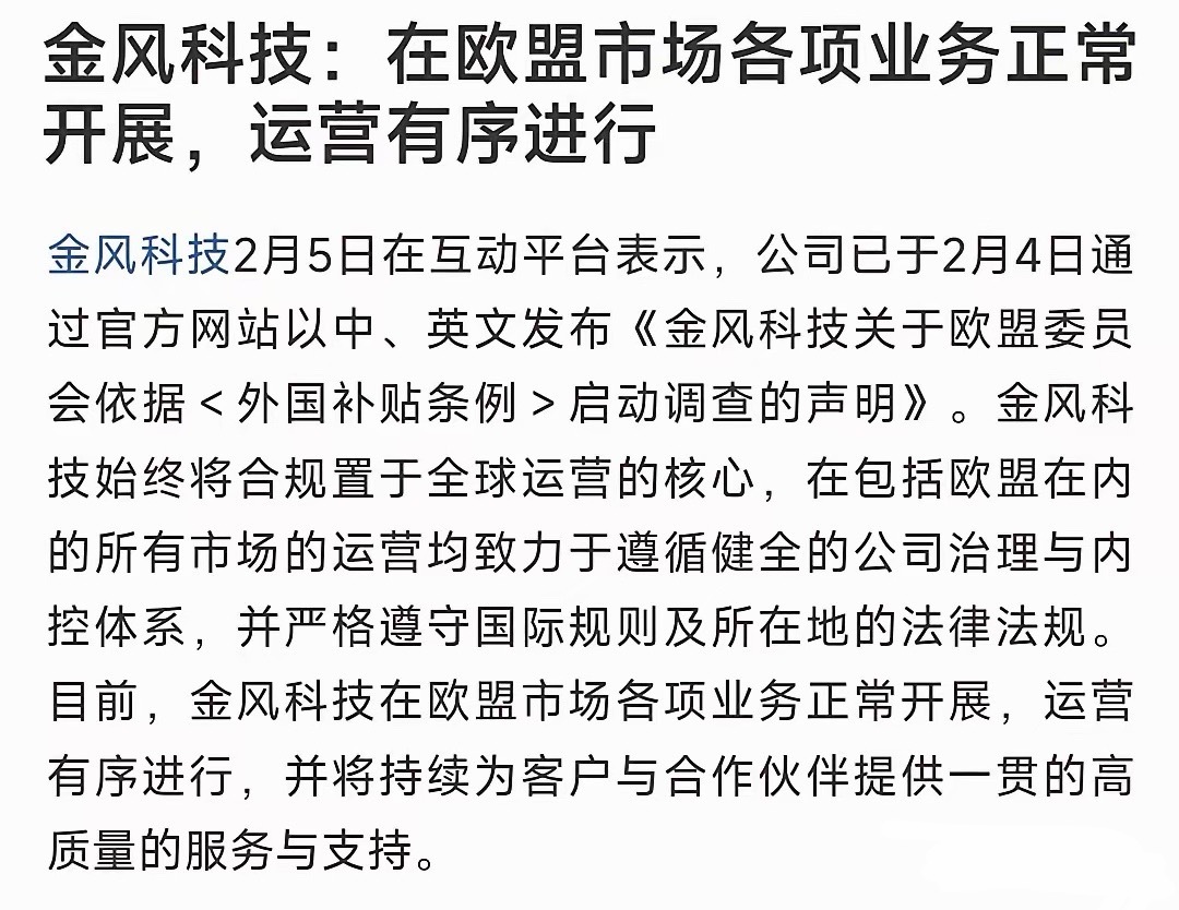 金风科技发文澄清:目前在欧洲运营正常昨天金风科技被爆出被欧盟调查的消息,今天A股