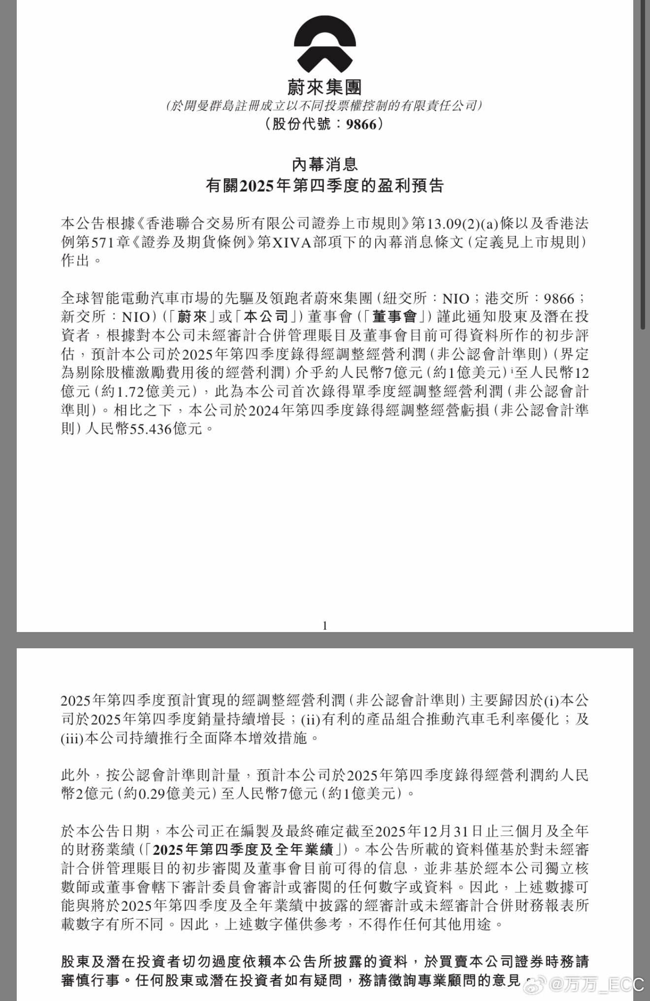 第一次!蔚来四季度预计盈利7-12亿人民币!