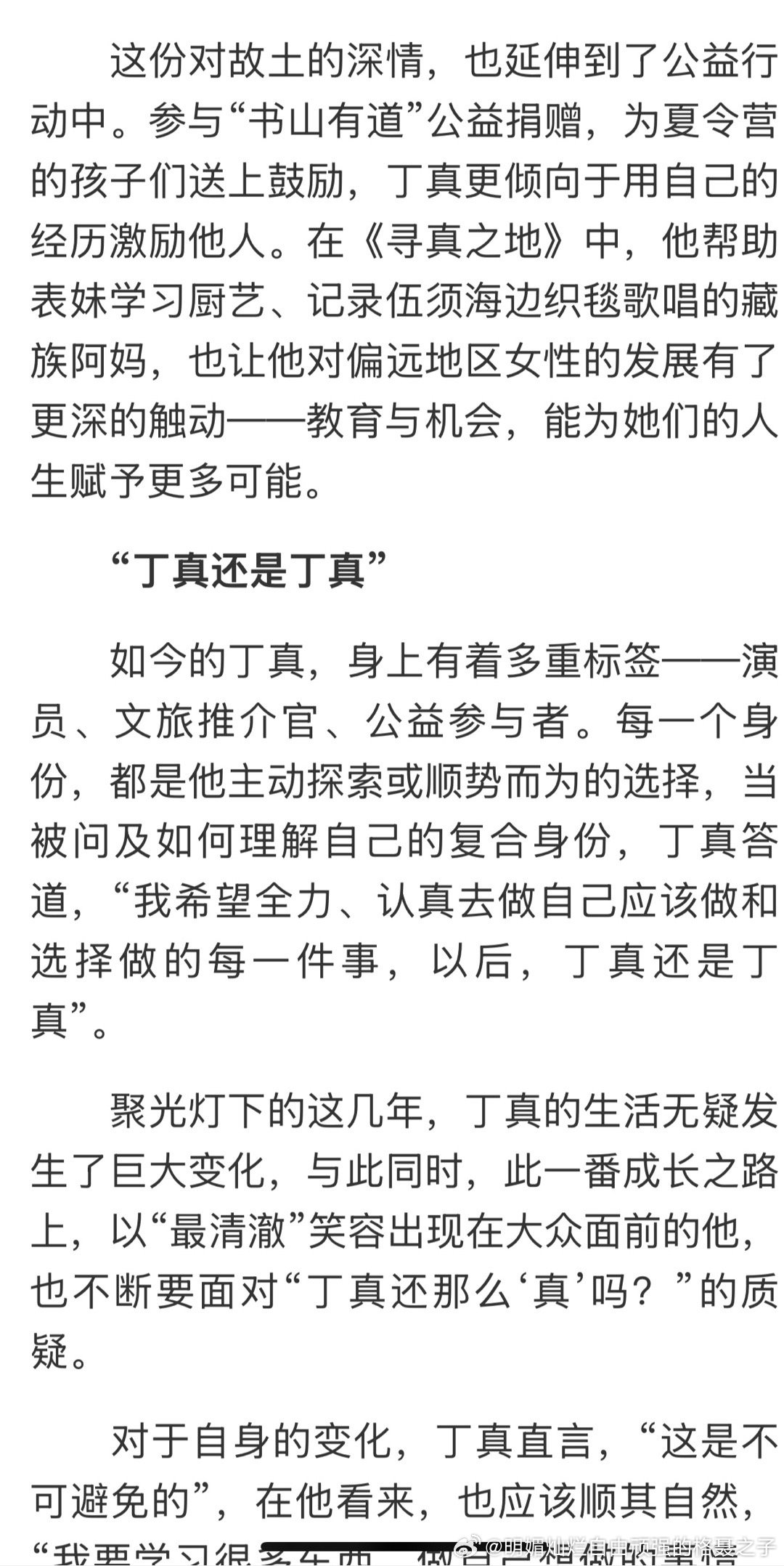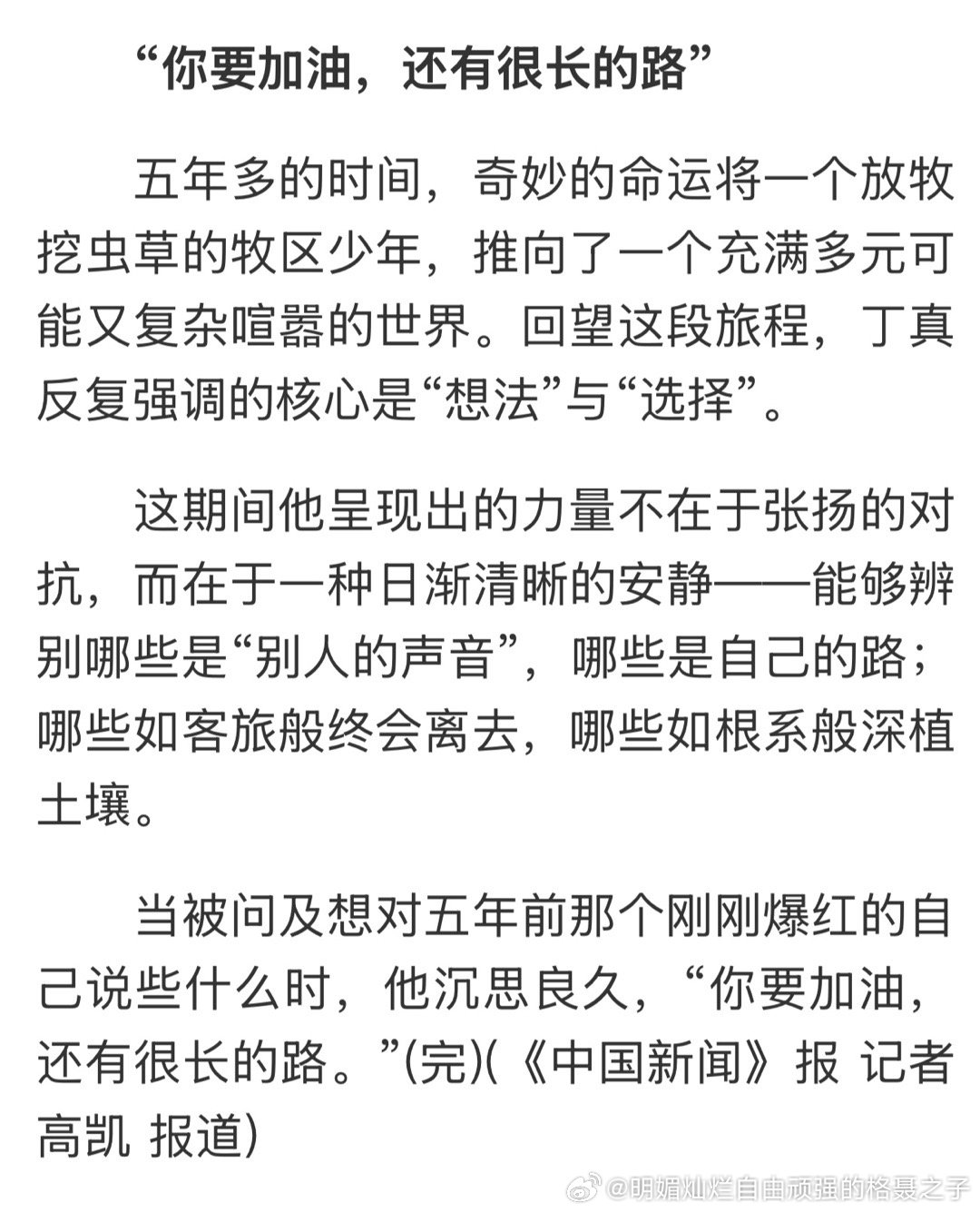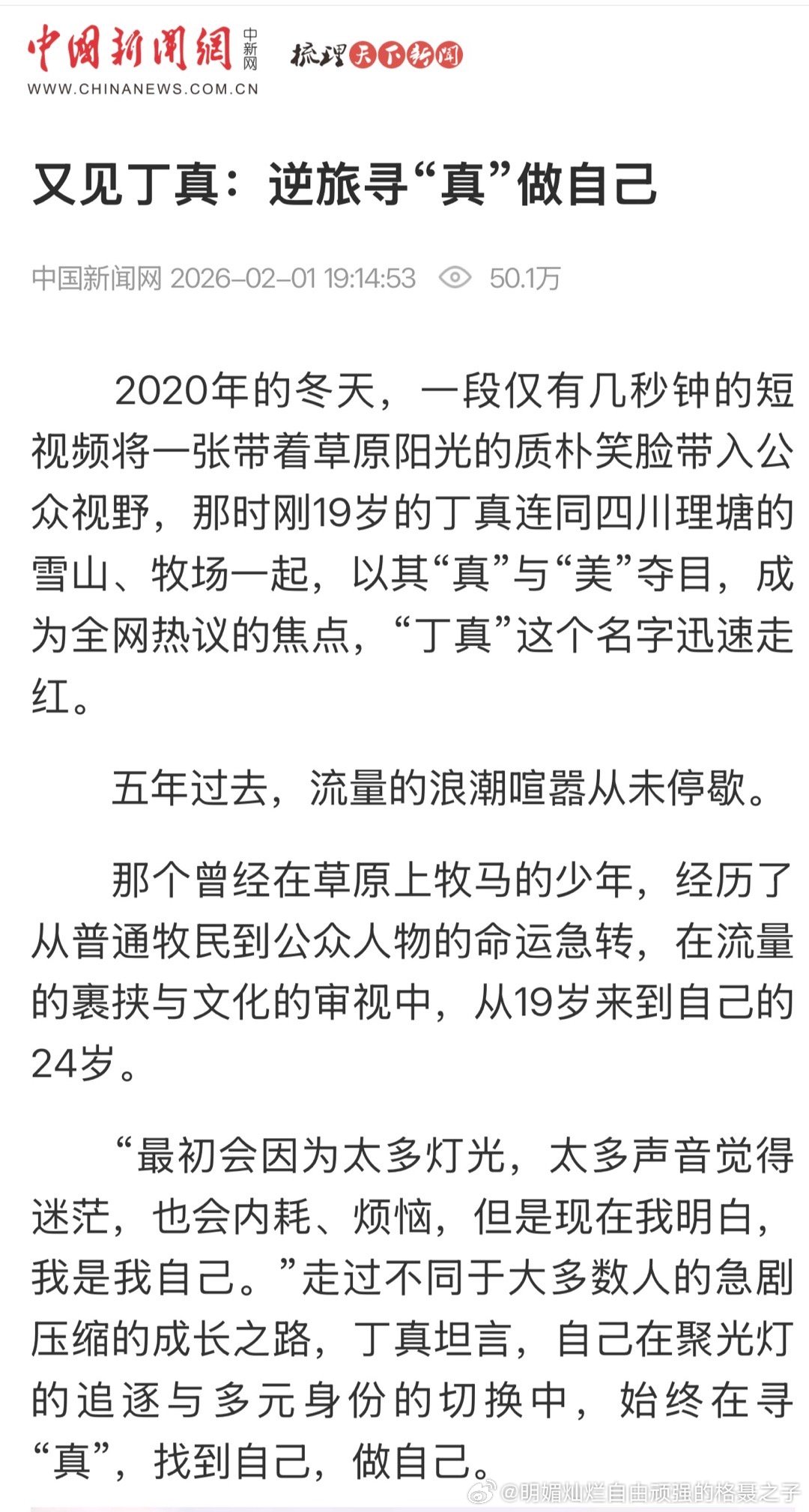 丁真真藏时光 20260201中国新闻报采访文章 “逆旅寻真做自己”存档你要加油,还有很长的路。无论外界如何喧嚣,听内心的声音,做自己。