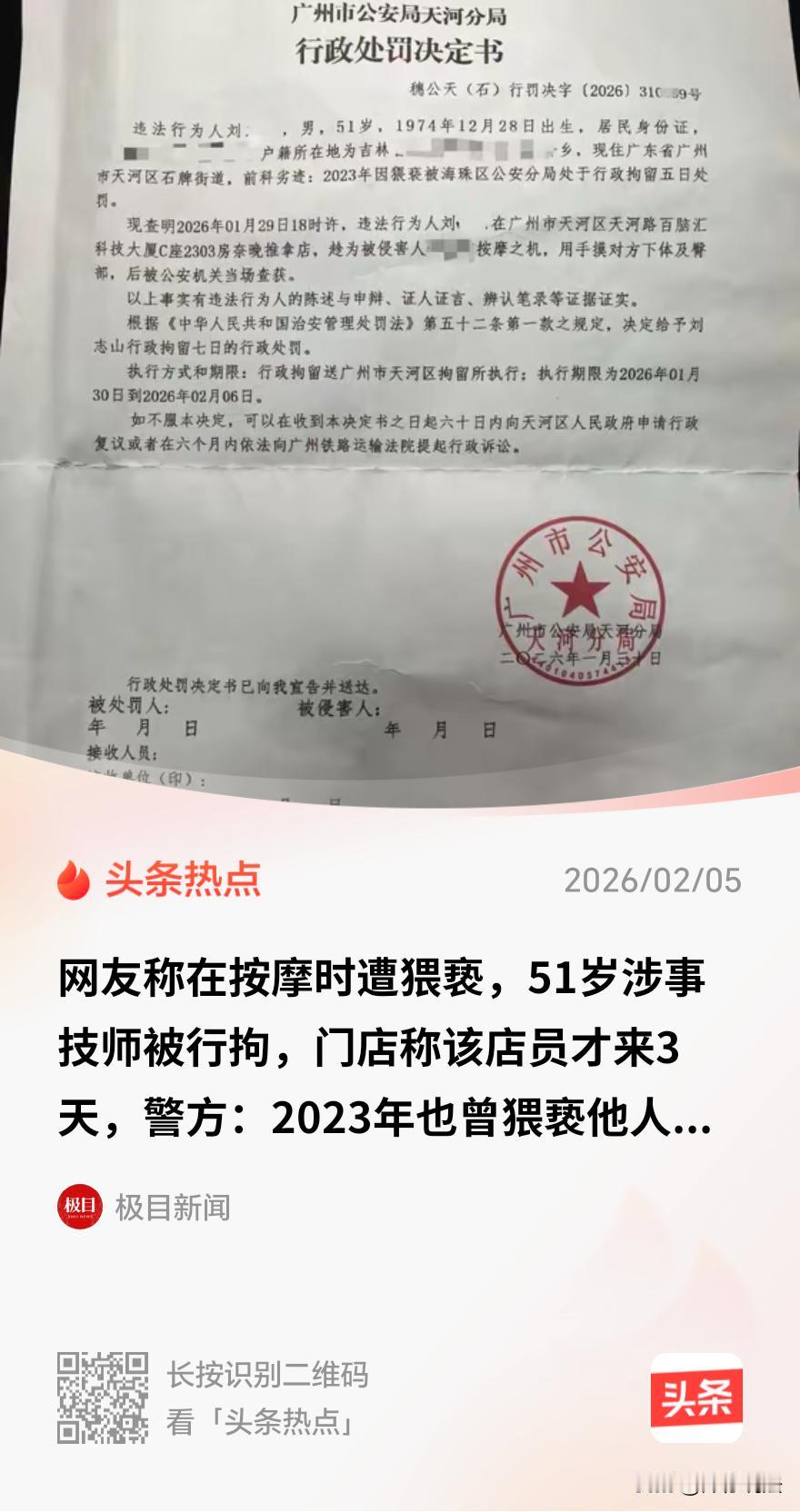 广州,一51岁男技师在独立房间内,正为20多岁的女孩按摩缓解疲劳。不料,男技师见女孩漂亮,心生邪 念,突然用手触摸女孩的隐 私部位。女孩没有选择隐忍,当即制止并报警。 警方调查发现,男技师并非初犯,其在多年前曾因猥 亵被行政拘留。事后,按摩店以涉事员工“刚来三天、还在试工期”为由试图推卸管理责任,甚至提出以“后续免费按摩”作为补偿方案,而门店负责人始终未正式出面解决问题。网友质疑:有劣迹前科者何以能轻易入职? 据悉,2026年1月29日傍晚六点,某推拿店内,灯光柔和,空气中弥漫着淡淡的精油香气。 20岁的林薇(化名)结束了一天的忙碌工作,带着对片刻舒缓的期待,走进了这家装修雅致的门店。 她未曾料到,接下来的一小时,将成为一段挥之不去的噩梦。 接待林薇的,是技师刘某,一位51岁、外表寻常的中年男子,刘某入职仅仅三天,尚在“试工期”。 按摩在独立的房间内进行,起初,一切似乎与寻常按摩无异。 然而,随着时间推移,林薇逐渐感到不安,刘某的手部动作开始偏离正常的按摩部位,游走向她的臀部等隐私区域。 林薇有些恐慌,明确表达了抗拒并立即终止了服务,随后在极度愤怒中报警。 警方介入后,经初步调查,刘某的违法行为事实清晰,警方进一步核查发现,这位“新手”技师并非初犯。 一份2023年年出具的《行政处罚决定书》显示,刘某曾因猥 xie 行为被处以行政拘留五日的处罚。 此次,刘某是在为另一名受害者提供服务时故技重施。 面对确凿证据,刘某对其趁按摩之机,故意触摸林薇身体隐 私部位的违法行为供认不讳。 随后,警方对刘某再次作出拘留处罚。 在警方处理完毕后,林薇转而向提供服务并雇佣刘某的推拿门店追责,希望能得到商家一个诚恳的道歉和负责任的解决方案。 然而,店方的反应却令她倍感心寒与二次伤害。 据林薇向媒体陈述,店方提出的所谓“解决方案”,竟是“后续免费到店按摩”。 这种完全漠视受害者心理创伤、将严重侵权行为轻描淡写为可被“补偿性消费”抹平的提议,让她无比愤怒。 林薇愤怒地反问:“想要让我回来想起被伤害的事吗?” 直至2月1日,林薇表示,门店负责人始终未曾正式出面与她沟通解决问题。 2月4日,推拿店的工作人员向媒体证实了事件属实,并称店长正在处理。 该工作人员特别强调涉事员工刘某“系刚招来的,还在试工期,第三天就被警方带走了”,试图逃避责任。 目前,林薇及推拿店并未披露最新进展。 那么,从法律角度,这件事如何评判呢? 《治安管理处罚法》第五十二条规定,猥 xie他人的,处五日以上十日以下拘留;猥xie精神病人、智力残疾人、不满十四周岁的人或者有其他严重情节的,处十日以上十五日以下拘留。 本案中,刘某在相对封闭、私密的按摩房间内,利用其为顾客进行身体按摩的职业身份和便利条件,故意触摸顾客林薇的臀部等隐 私部位,该行为违背受害人意志,侵犯了其合法权益,构成治安违法。 公安机关对刘某处以七日拘留,是在五日以上十日以下的法定幅度内作出的决定,这说明公安机关认为刘某的行为未达到严重情节。 有人说,刘某在2023年时有相同违法行为,也就是有前科,依法应该以严重情节加重处罚。 不过,《治安管理处罚法》第二十二条规定,违反治安管理有下列情形之一的,从重处罚:……(四)一年以内曾受过治安管理处罚的。 具体到本案,刘某前次处罚在2023年,距离本次已远超一年时间。 所以,本次违法行为并未因刘某有违法前科认定为严重情节。 但是,公安机关仍然考量了刘某利用职务之便以及有前科的因素,在法定幅度内,从重处罚。 此外,《消费者权益保护法》第七条、第十八条,经营者负有法定的“安全保障义务”,必须保证其服务场所与人员符合保障消费者人身安全的要求。按摩服务具有身体接触性、空间私密性,经营者此项义务标准更高。具体而言,该义务涵盖 “事前审慎审查”与“事中有效管理”。 就本案而言,刘某在2023年有同类型违法记录,无论店家是否实际查知,此可公开查询的记录意味着,招聘其从事密切身体接触工作本身即蕴含显著风险。 店家未能有效筛查或虽知悉但仍予录用,均属未尽审慎审查义务。 同时,“试工期”恰恰是风险高发阶段,店家更应加强监督与培训,其以“仅三天”为由推责,恰恰暴露出其岗前管理流程存在漏洞,未能采取合理预防措施。 《民法典》第一千一百九十一条规定,用人单位的工作人员因执行工作任务造成他人损害的,由用人单位承担侵权责任。 鉴于刘某的违法行为发生在提供店内指派的服务过程中,其行为后果依法应先由作为用人单位的推拿店对外承担。 基于此,林薇有权要求店家承担赔礼道歉、赔偿精神损害抚慰金等侵权责任。 对此,您怎么看?