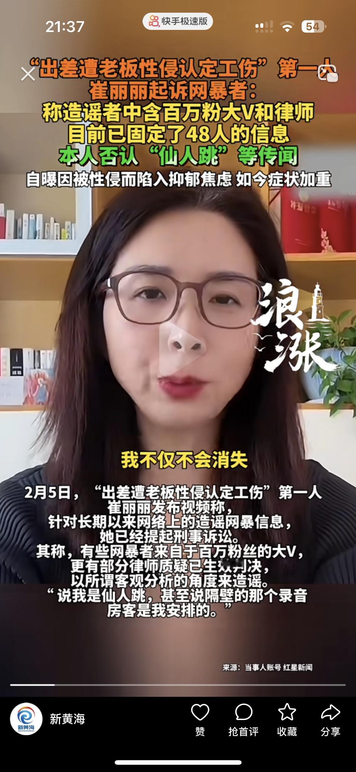 真让人无语!崔丽丽女士把网暴者起诉了 她是被出差老板性侵后把老板告了,不仅如此,还笑着把性侵的过程讲了出来 大家都很纳闷,她怎么如此坦然甚至笑着当着老公的面能讲出来呢?可能也有人觉得匪夷所思,不难看出她是个狠人,大家还是嘴下留情,避免给自己惹来不必要的麻烦