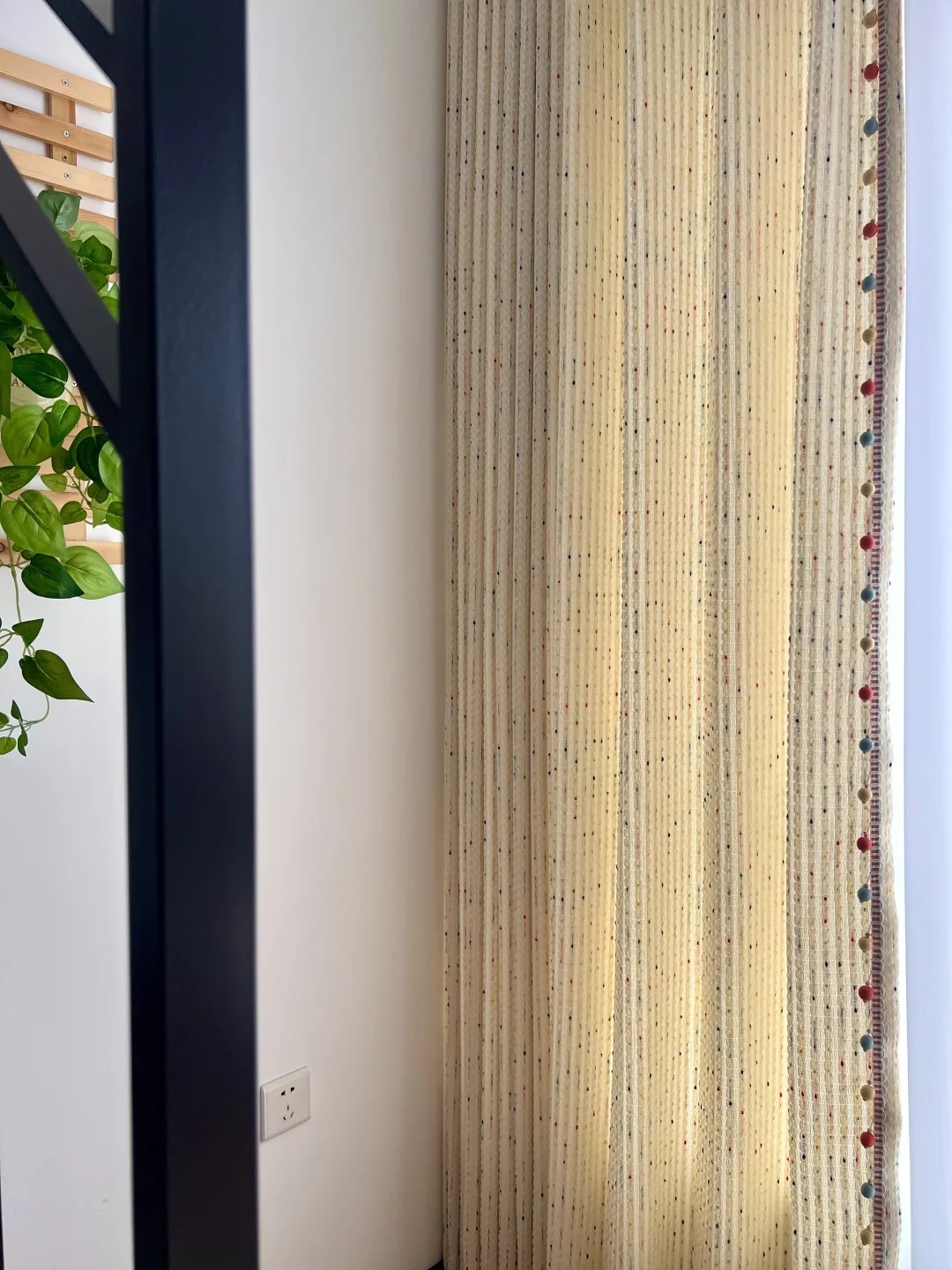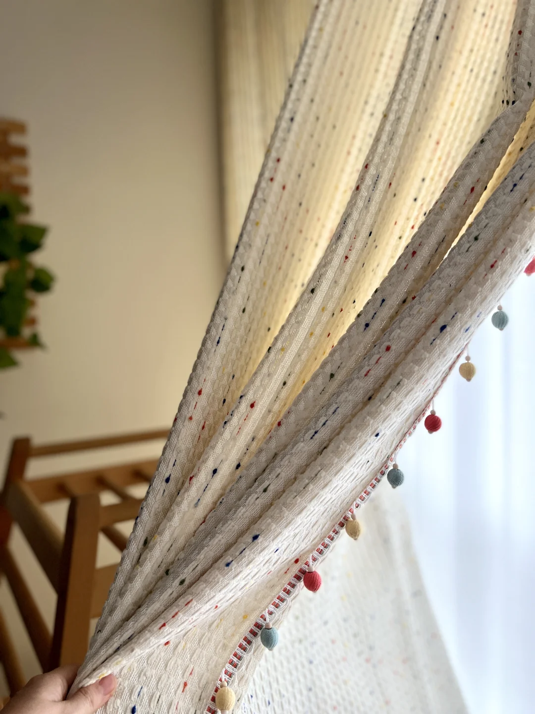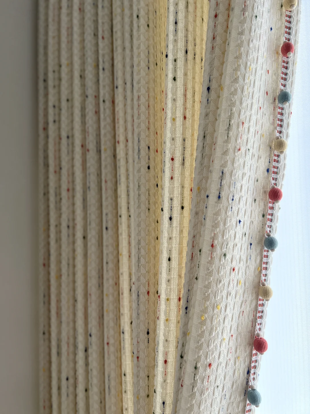 挖到宝了! 这款彩虹豆窗帘直接让儿童房颜值翻倍✨ 奶油米底色+彩色糖豆点,再加上侧边马卡龙毛球花边,软萌又治愈!摸起来像撸猫一样软fufu~ 白天拉上能挡住大半阳光,面料垂感很好。不管是ins风、童趣风还是简约原木风的儿童房它都能完美融入,妈妈们可以闭眼冲!
