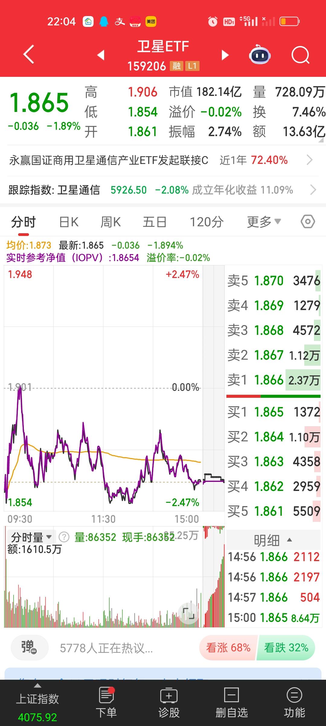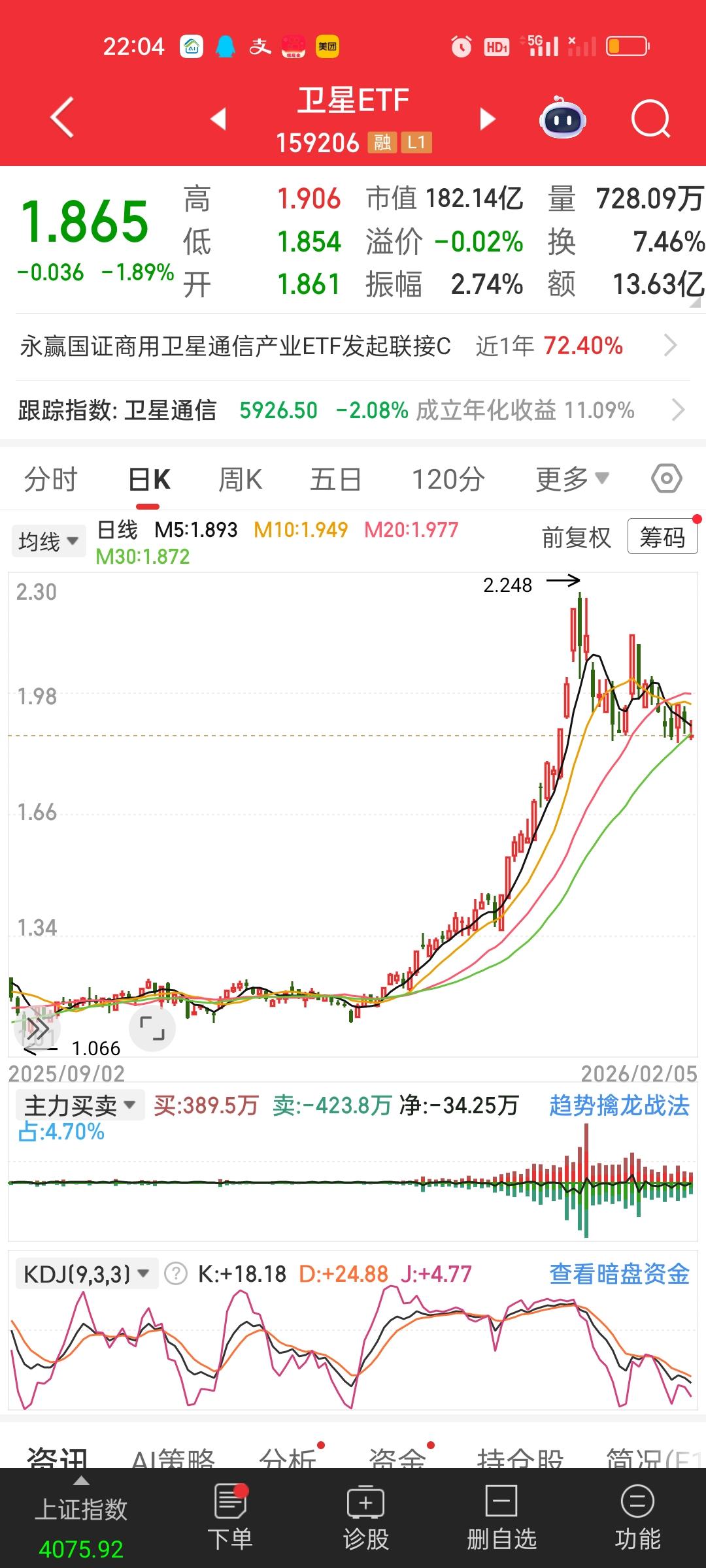 商业航天今天收盘没有跌破30日线,但卫星ETF今天收盘跌破30日线了。原因很简单卫星ETF的跌幅更大,跌了1.89%,商业航天板块跌了1.62%,刚好就差这0.27%,30日线就跌破了。其实用不着惊慌,因为除了商业航天,光伏,CPO,数字经济等跌幅也挺大的。明天还是要看看有没有修复行情。