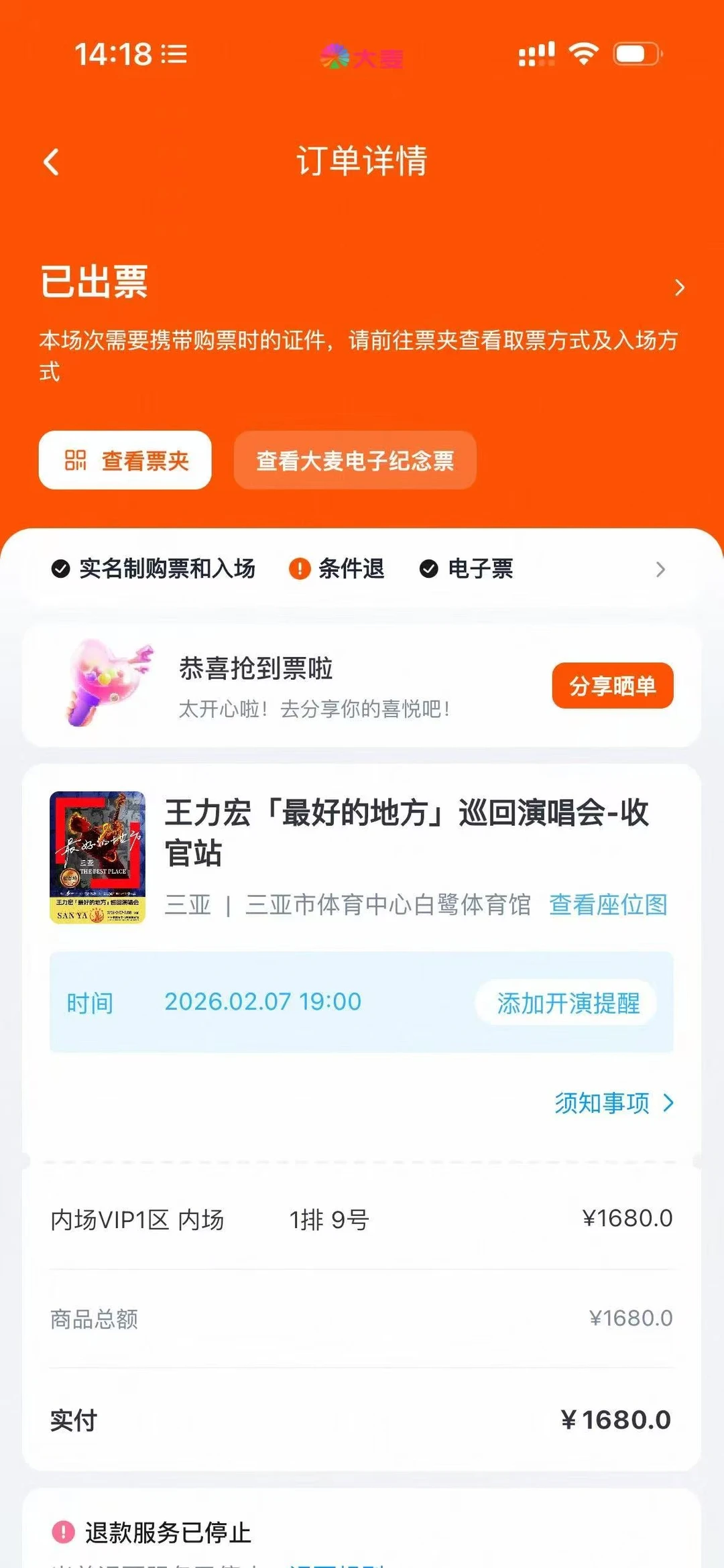 内场VIP1区第一排9号!!!期待2月7号见!