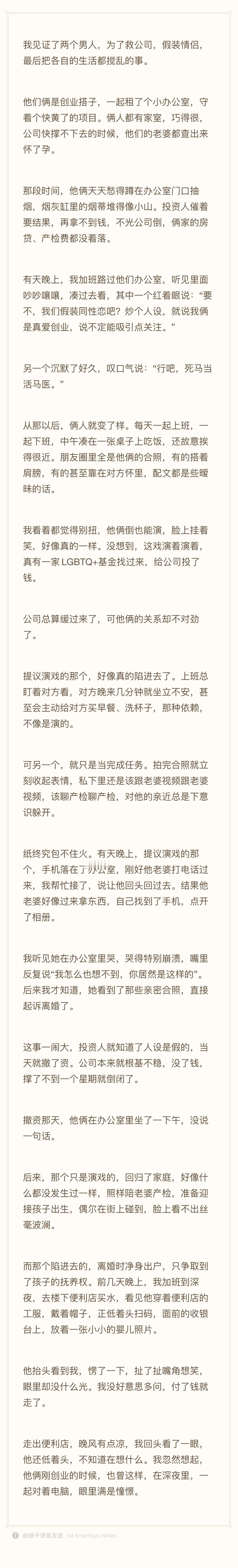 有天晚上,我加班路过他们办公室,听见里面吵吵嚷嚷,凑过去看,其中一个红着眼说:“要不,我们假装同性恋吧?炒个人设,就说我俩是真爱创业,说不定能吸引点关注。”
