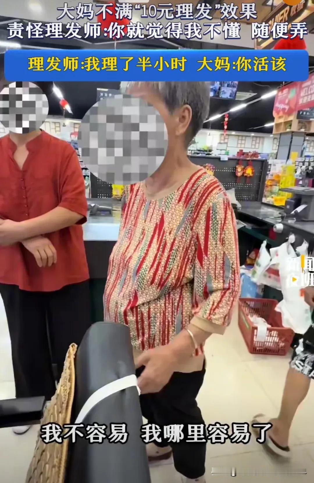 这是一位大妈新剪的发型,大家看如何?这位大妈不满这“10元理发”的效果,一直嚷嚷着跟人店主吵架呢:你就觉得我不懂,随便弄。 理发师无奈修剪着大妈的短发,可半个小时过去了,大妈还是不满意。理发师叫屈:姐姐,大家都是这么理的!我也不容易,已经给你剪了半个小时了。 谁知大妈说,你这10块钱挣得多容易啊,剪半个小时也是你活该。 算了下,除去水电、房租、器材耗损,像这种10元理发店,顾客如果都像大妈这样,估计店主的收入还不如外面10元一小时的小时工[捂脸]! 你见过这样的老人吗?花钱消费跟截地肺管子似的,总要撒泼、充大爷[偷笑]