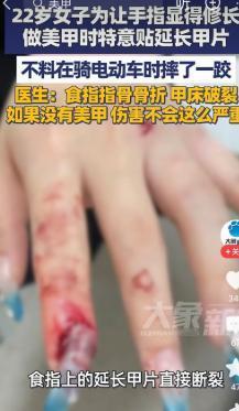 “悲剧还是发生了!”近日,浙江杭州,一女子为了让手指显得更修长,在做美甲时特意延