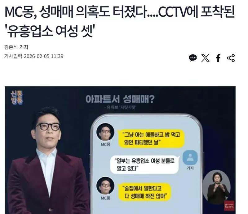 夜邀3女!韩知名男星遭控 忄生 交易!豪宅频叫小姐!其他住户无法忍受投诉举报! 韩歌手兼制作人 MC梦(本名申东贤)近期可说是风波不断,接连卷入多起私生活争议。 先前才被娱乐公司 One Hundred 代表车佳媛点名爆料,指控两人曾有不伦关系,甚至牵扯出“海外赌博”与高达近300亿韩元的金钱支援传闻。 尽管 MC梦已出面否认不伦说法,如今又再被点名涉及性交易疑云,争议一波接一波,外界关注度持续升高。 4日播出的 TV CHOSUN 时事节目《新通放通》,引述 YouTube 频道“지릿지릿”公开的《周日时事》记者金成珉采访内容,针对 MC梦位于首尔市中心的高级公寓竟疑似成了性交易场所一事进行报导,再度引爆话题。 节目中公开的公寓监视器画面显示,深夜约11时左右,一名男子与3名疑似酒店女公关的女子一同搭乘电梯,画面拍摄地点被指正是 MC梦居住的公寓,相关影像曝光后随即引发争议。 金成珉记者在节目中表示,该公寓管理单位曾多次接获住户投诉,内容指称社区内疑似出现性交易行为,管理室因此基于查证事实的目的,调阅并公开相关监视器画面。 他也转述,当将该段画面出示给 MC梦后,对方“在一定程度上承认相关情况”,并表态将主动退居幕后,暂时退出相关公司业务。 据了解,与 MC梦同住在该公寓的住户,曾以“住宅空间疑似被作为性交易场所使用”为由,向管理单位提出申诉,管理室才在调查过程中确认并保存了这段影像。 面对指控,MC梦起初否认,解释当天只是与熟人聚餐后回家喝酒。 然而,当外界指出画面中部分女性被认为是娱乐场所从业人员时,他则回应表示:“在酒吧或夜店工作,并不等同于从事性交易。” 不过随着后续采访持续进行,相关人士转述,他已对部分疑点作出承认。至截稿前,MC梦仍未就此事发表正式对外声明。 在多项争议接连浮上台面之下,MC梦是否会进一步出面说明,以及后续动向如何发展,持续成为外界关注焦点。 韩网热议:到底叫了多少次,居民才会去举报不是吧,居民们到底有多气愤啊居民们肯定超级烦的...小孩和女生应该都看得到那些状况吧逃兵役、逃税、性交易...唉居民们都来举报了,这究竟找了多少女生来啊,唉...哇,这人品到底有多低劣,我都想像不到哈哈哈哈现在邻居之间都不太关心对方,这到底有多严重,才会有人去举报啊。居民们应该觉得自己住的公寓变成烂地方,心情很差吧…