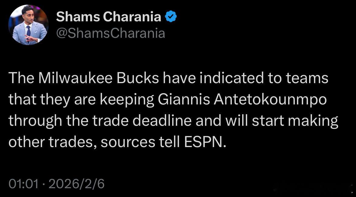 Shams:字母哥留队,雄鹿已告知各球队!雄鹿将在截止日前留下字母哥,并转向进