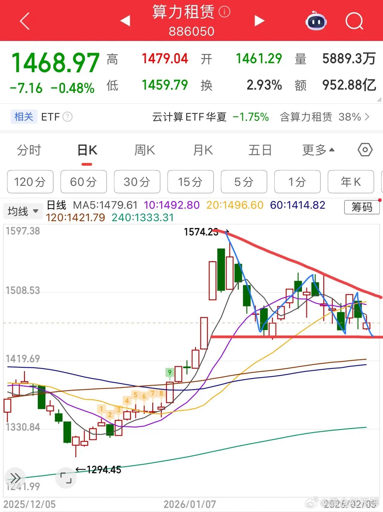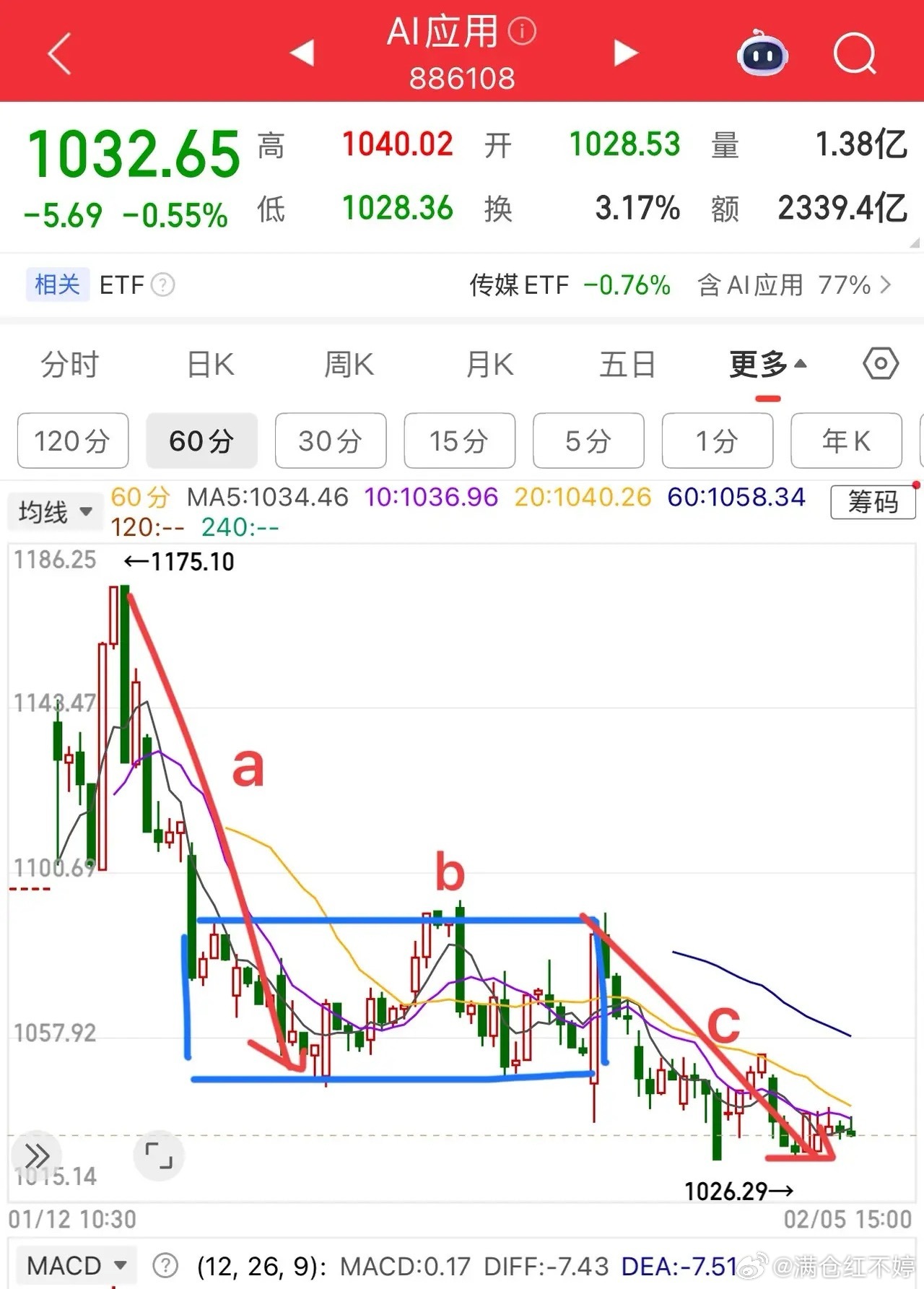 板块方面,商业航天处于下跌通道运行,可关注其回踩通道下轨后的支撑机会;AI应用呈现abc调整形态,目前c段下跌力度已减缓,若60分钟级别形成金叉,将触发底背离条件;算力租赁则处于收敛形态末端,后续需重点关注方向选择信号,耐心等待明确机会出现。