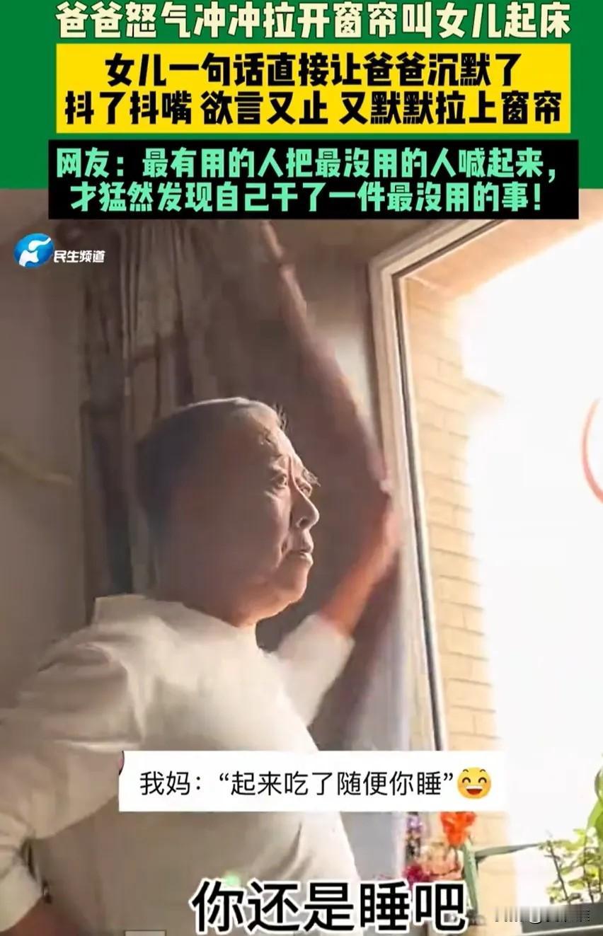 清晨九点的阳光已在窗外铺了满世界,卧室里却仍是一片昏沉的暗。窗帘严密地合着,将整个房间裹成一个柔软的茧。女儿醒是醒了,却仍蜷在被窝里,手机屏幕的光幽幽映着她半张脸。 父亲在门外踱了两回,终于忍不住了。他“唰”地一下推开门,带着一股风走到窗前,不由分说便扯开了窗帘。骤然涌入的光线利剑般劈开昏暗,灰尘在光柱里慌乱飞舞。 “几点了还不起?”他的声音里有种积攒了一早上的、不容置疑的威严。 女儿眯着眼,适应着突如其来的光亮,却没动弹,只从被子里闷闷飘出一句: “爸,你天天叫我起来……可我起来以后,能为这个家做啥啊?” 话很轻,却像一颗小石子,不偏不倚地投进了父亲情绪的深潭里。他张了张嘴,那套关于“早起身体好”“不能浪费光阴”的道理已到了嘴边,却忽然被这个最简单的问题给堵了回去。能为这个家做啥?他快速地在脑子里盘点:早饭他已做好,地板也拖过了,似乎……确实没什么非得她起来不可的事。 他站在那片明亮的阳光里,眨了眨眼,嘴唇无声地开合了两下,像个忽然忘了台词的老演员。刚才那股理直气壮的气势,不知不觉泄了下去。几秒钟的沉默,长得像一个世纪。最后,他什么也没说,只是转过身,伸出手,又将那面厚重的窗帘缓缓地、默默地拉了回去。房间重新沉入舒适的昏暗,仿佛刚才那场小小的“起义”从未发生。 这一幕被分享到网络上,瞬间戳中了无数人。有网友精准调侃:“家里最‘有用’的人,试图叫醒最‘没用’的人,结果发现自己做了件最‘没用’的事。”笑过之后,又品出一丝复杂的况味。这绝非编排的剧本,而是千万个中国家庭里最真实的切片——那种掺杂着气愤、无奈,最终又归于理解和妥协的复杂情感,在父亲愣神的瞬间和拉回窗帘的动作里,流露得淋漓尽致。 我们似乎总在这样的循环里:父母习惯性地催促,认定“起床”本身便是一种积极的正轨,而子女在成长中,开始质疑每一条“既定轨道”的意义。催促的背后,是怕你虚度,是爱的一种惯性表达;而那句慵懒的反问,也并非全然是顶撞,它或许是一个刚刚接触庞大世界的年轻人,对自身角色和价值一次懵懂而诚实的探寻。 家的微妙温暖,恰恰就藏在这些“无用”的摩擦里。有人不厌其烦地催你早起,嫌你碍事,恰恰证明你仍被安稳地爱着,仍拥有一个可以完全放松、甚至显得“无用”的港湾。终有一天,你会熟练地料理一切,不再有人念叨你为何还不起床,到那时,你或许会分外怀念这个早晨——怀念那束曾被拉开又合上的阳光,和那份笨拙而柔软的、欲言又止的关切。 所以,在还能被当作孩子“嫌弃”的时光里,不妨就安心地做一会儿“无用”的人吧。那幅父亲拉上窗帘的剪影,比任何言语都更温柔地诉说着:家,有时就是一个允许你暂时找不到意义,却依然为你保留一席之地的地方。