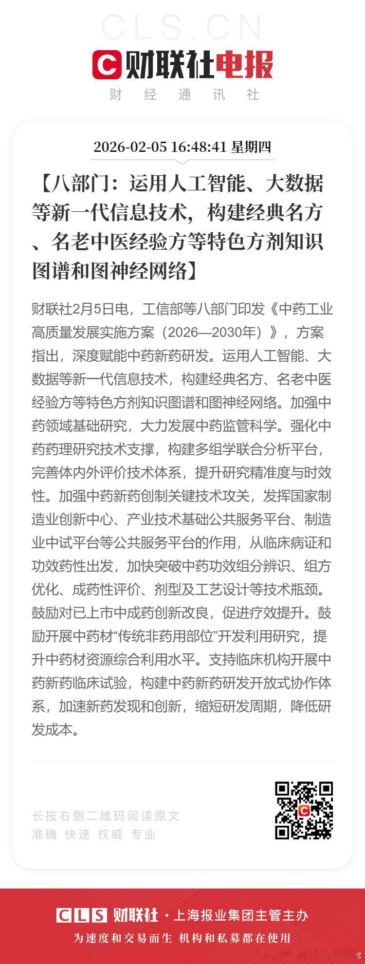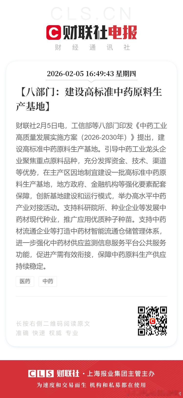 财联社2月5日电,工信部等八部门印发《中药工业高质量发展实施方案(2026—2030年)》:【八部门:到2030年中药工业全产业链协同发展体系初步形成】【八部门:打造中药饮片优势单品】 【八部门:运用人工智能、大数据等新一代信息技术,构建经典名方、名老中医经验方等特色方剂知识图谱和图神经网络】【八部门:建设高标准中药原料生产基地】【八部门:加大中药工业企业上市培育力度】