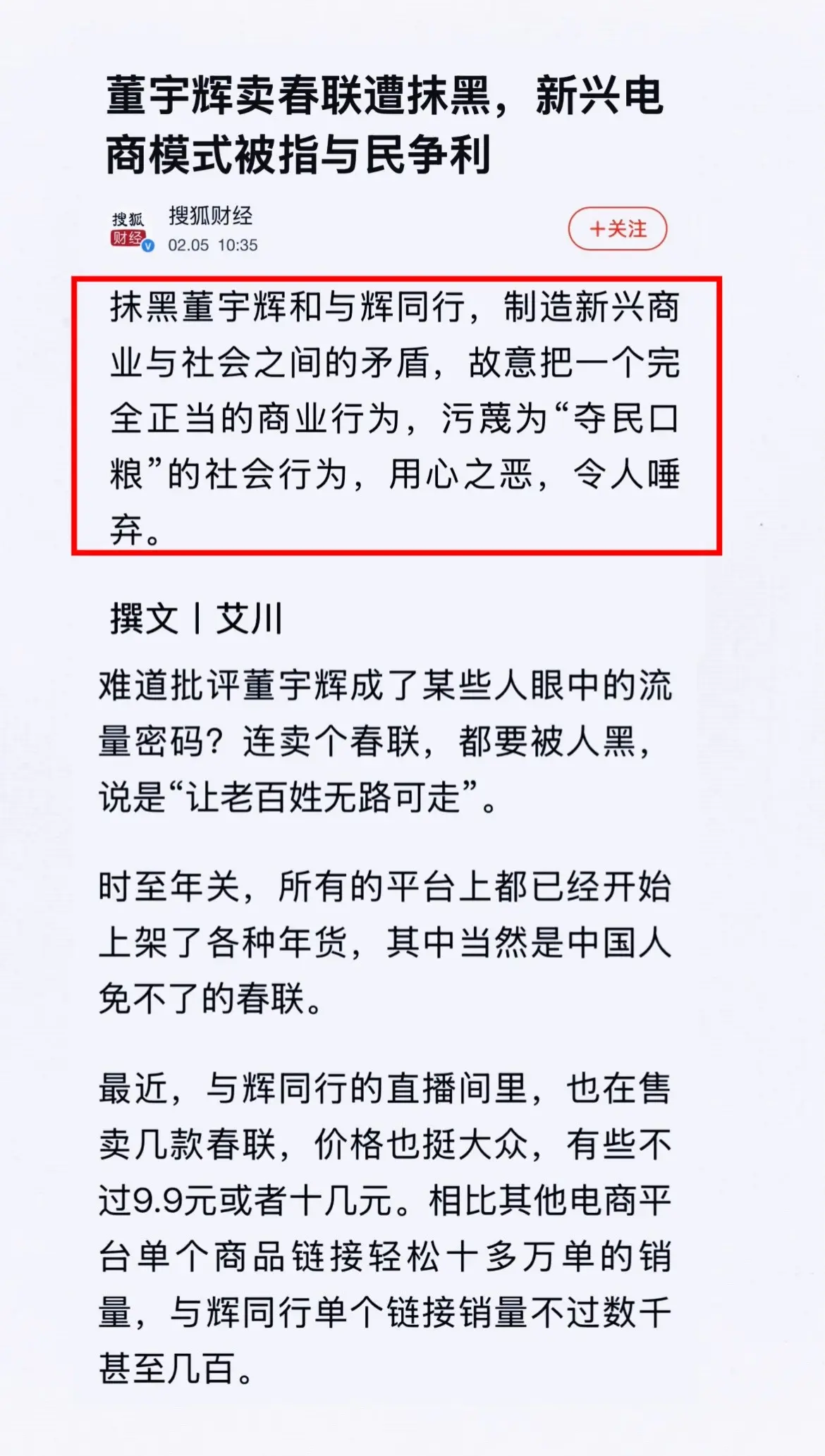 抹黑董宇辉和与辉同行,制造新兴商业与社会之间的矛盾,故意把一个完全正当的商业行为,污蔑为"夺民口粮"的社会行为,用心之恶,令人唾弃。