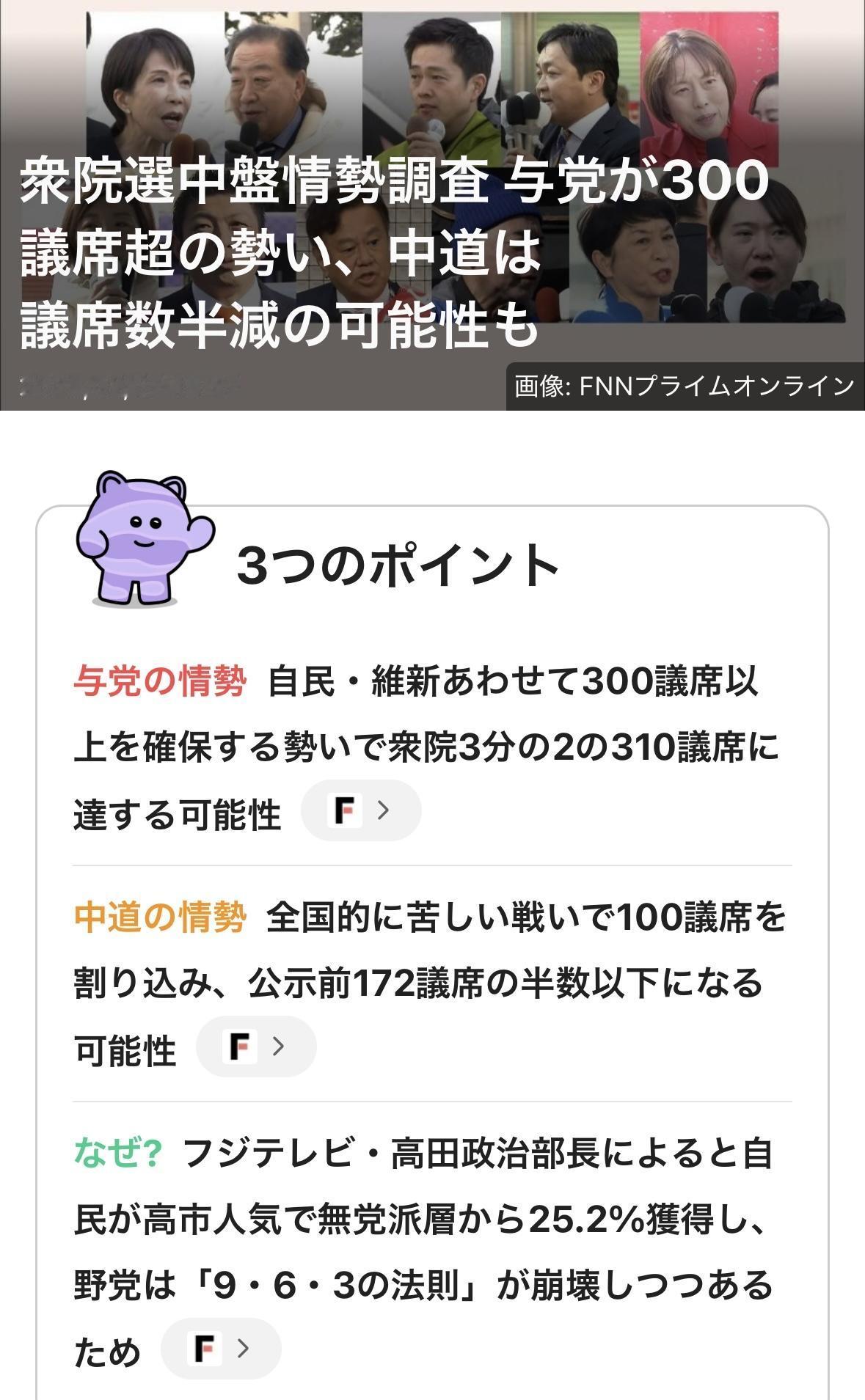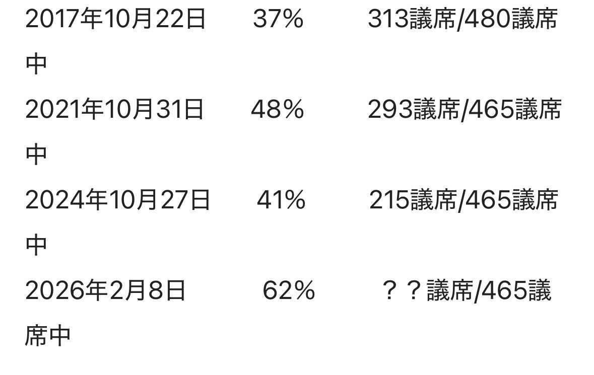 对日媒预测这次自维执政联盟可拿下超300议席,被称“选举之神”的久米晃认为众议院选举“自民党不会大胜,不要侮辱创价学会的行动”。每次选举教科书级别的公明党母体的创价学会的日本最强组织动员能力都是有目共睹的,不知道这次立宪民主党和公明党组成中道后会不会继续辉煌?目前执政联盟只有2014年(第三次安倍内阁)、2017年(第三次安倍内阁第三次改组)获得过超300个议席。 不过,当时执政党没有旧统一教会、黑金政治、透漏健康保险等问题。 现在高市和旧统一教会关系、黑金政治等问题被《周刊文春》连日爆料,日本维新会因浪费50亿日元经费强推大阪府知事大阪市市长选举,透漏国民健康保险费被骂惨了,在自己的大本营关西地区名声都很臭了。本来可以让高市和自民党大败的。 只可惜在野党不团结,攻势也太弱了。所以,大概率自维执政联盟最多只是小赢,不大可能大胜。