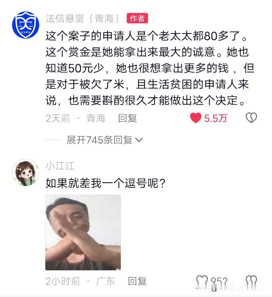 这个执行人赏金只有50元,据说是骗了老太太40万,是老太太一辈子的积蓄,这悬赏的50元也是老太太自己出的。 说实话,现代社会对老赖的宽容度太大了,感觉一个人欠了钱,你拿他没办法。强制执行吧,无非拘留。那些被欠的人,只能打碎牙咽进去。比如这位老太太,她能怎么办,钱要不回来,什么也没有了,而老赖早已拿她的钱挥霍一空,你让他还吧,他拿什么还呢? 有人感慨,坏人不会有报应。好人也不会有好报。这能有什么办法呢?正常人能做的就是提高警惕,加强防范意识,多读书,多增长见识,提高认知水平,什么该做,什么不值得去做,真的可以避免很多不必要的麻烦,无论是谁,都别想打我的主意。