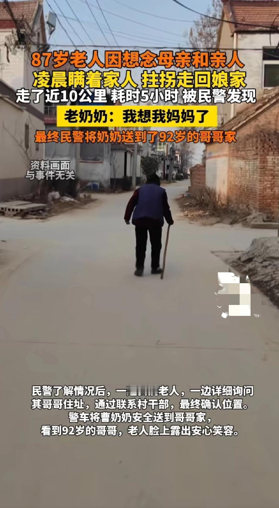 87岁的曹奶奶拄着拐杖,在凌晨的寒风里走了近10公里路,花了整整5个小时! 她不是迷路,也不是赌气,只是想瞒着家人,回趟娘家。 民警找到她时,老人像是一个怕被骂的小孩儿,小声说:“我想我妈妈了!” 原来,不管活到多大年纪,心里最想念的还是妈妈,在妈妈面前,我们永远都是那个会撒娇、会耍赖的小孩。 最后,民警把她送到了92岁的哥哥家里,看到哥哥的那一刻,她脸上露出了安心的笑容。 行动不便的奶奶