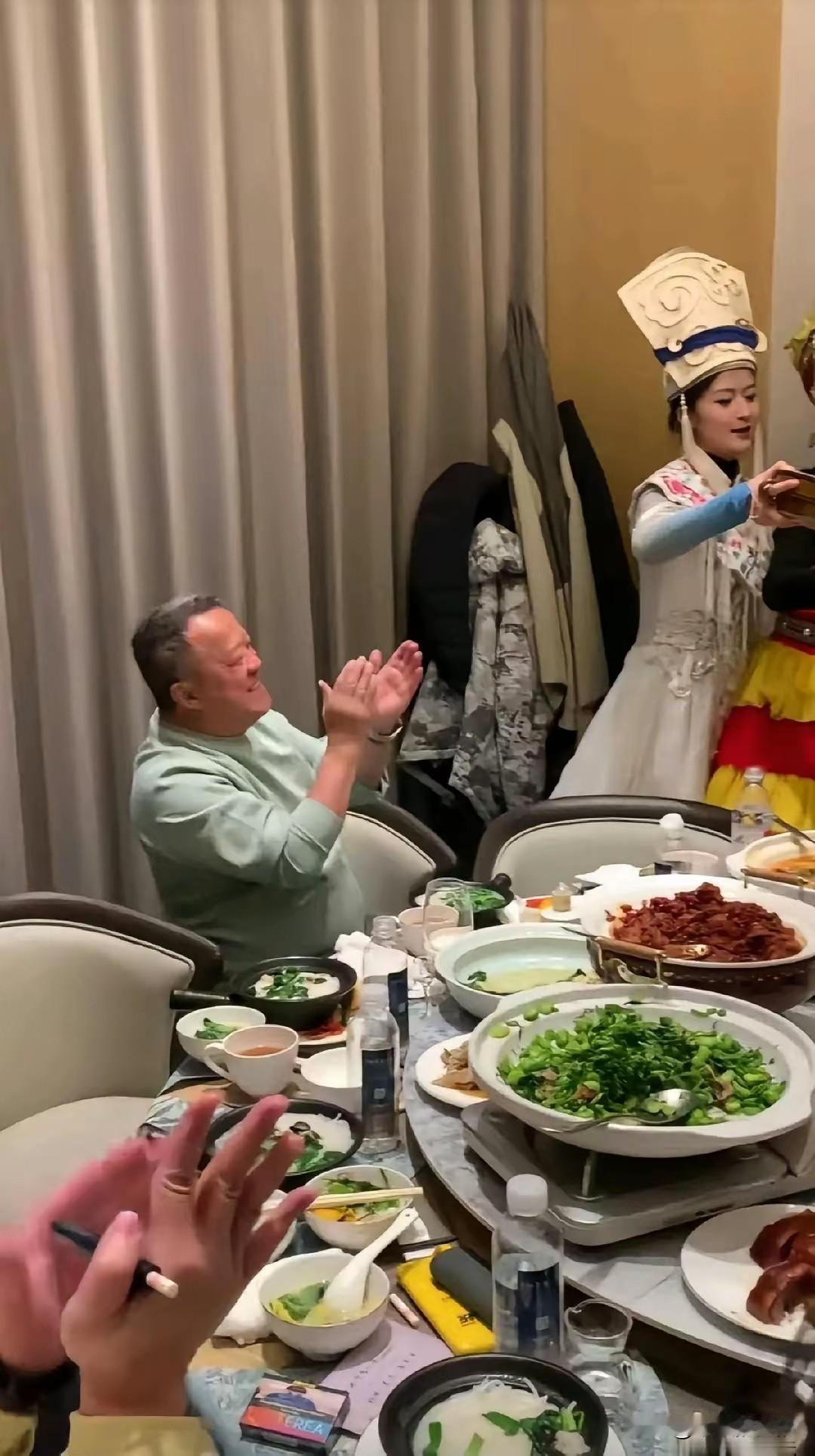 媳妇正在夹菜,朋友疯狂转桌。男子笑脸暴起,下手抓盘,把菜丢妻子碗里。妻子身上被溅