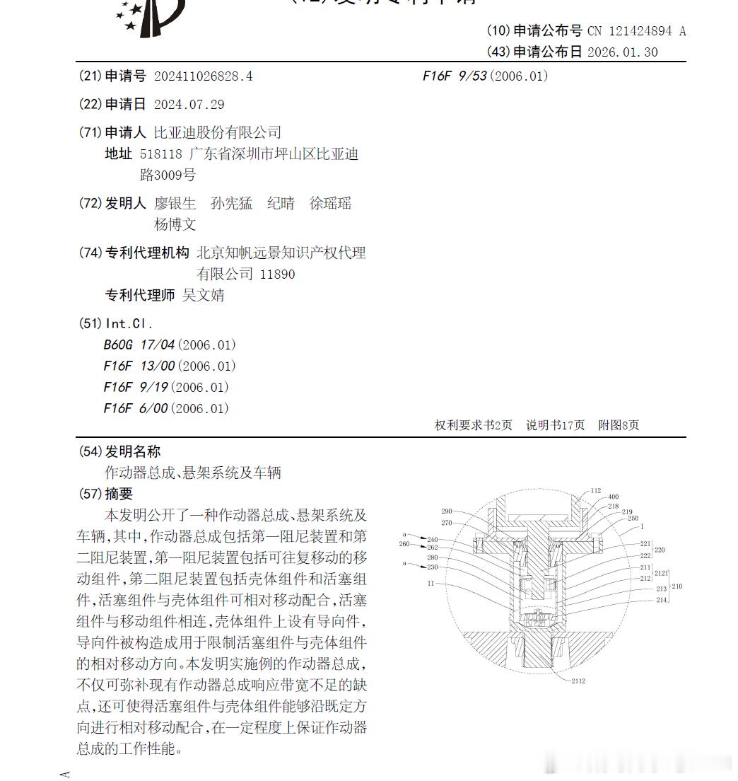 技术巡猎 比亚迪“作动器总成、悬架系统及车辆”,最近批量刷悬架专利,迪子看来不久是要有大动作了,我们挑其中一个简单讲讲---这个专利主要是在承认一个课题:主动悬架有物理边界,并不是万能的,然后用一段“被动阻尼”解决高频最烦人的碎震。