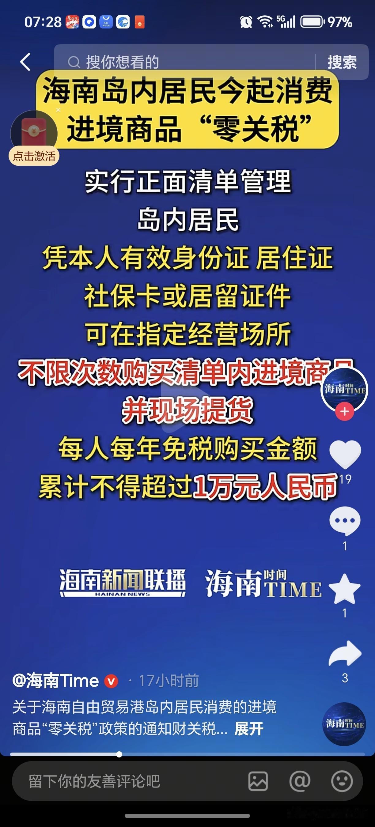 打开手机电视满屏是岛内居民自己的“零关税”福利落地的消息。心里那叫一个高兴,心想咱土著岛民这回总算是购买“零关税”自由了吧,再也不用坐船过海去徐闻特种兵一日游了,想想就美滋滋! 浏览了一下通知细则,心里的那种高兴劲瞬间就没了。看了三条就不想往下看了。且看: •每人每年累计免税额不得超过1万人民币,这是嫌岛民们消费不起吗,还是怕岛民买多了?这1万能买个啥?一块表一个手机都不够买的,想买还得是徐闻特种兵一日游走起[笑哭] •岛民消费的“零关税”商品清单,上面罗列了202种,大都是日常生活低额易耗品,例如奶粉、冰冻水产品、水果啥的。说实话可买的商品选择太少了。 •岛民“零关税”指定经营场所购买,这也太不方便了吧? 不多说了,咱要去搬砖了[大笑]。