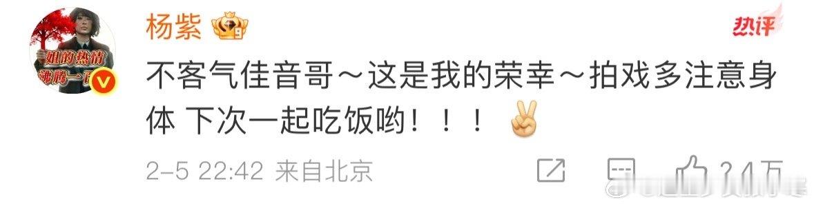 杨紫回应雷佳音杨紫回复雷佳音下次一起吃饭哟雷佳音感谢杨紫帮领奖,杨紫回应雷佳音啦,这俩的互动真的让人感觉很舒服。