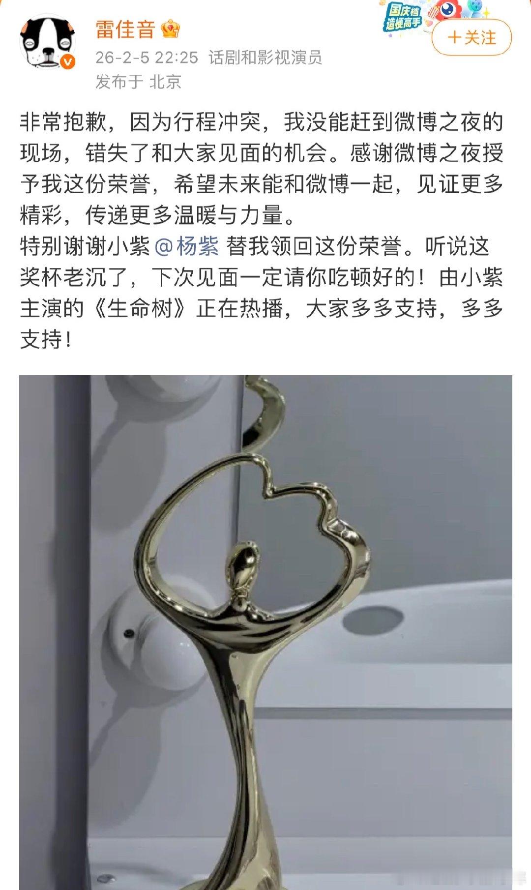 杨紫回应雷佳音杨紫回复雷佳音下次一起吃饭哟雷佳音感谢杨紫帮领奖,杨紫回应雷佳音啦