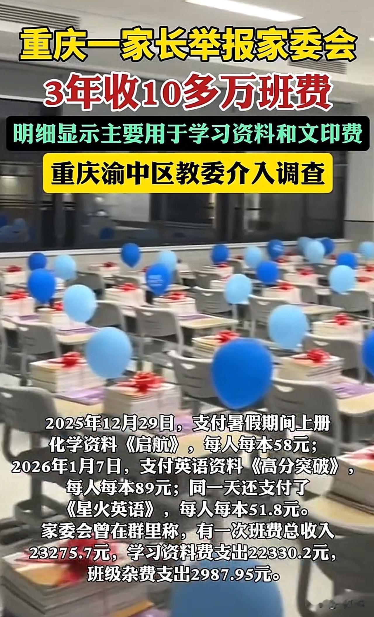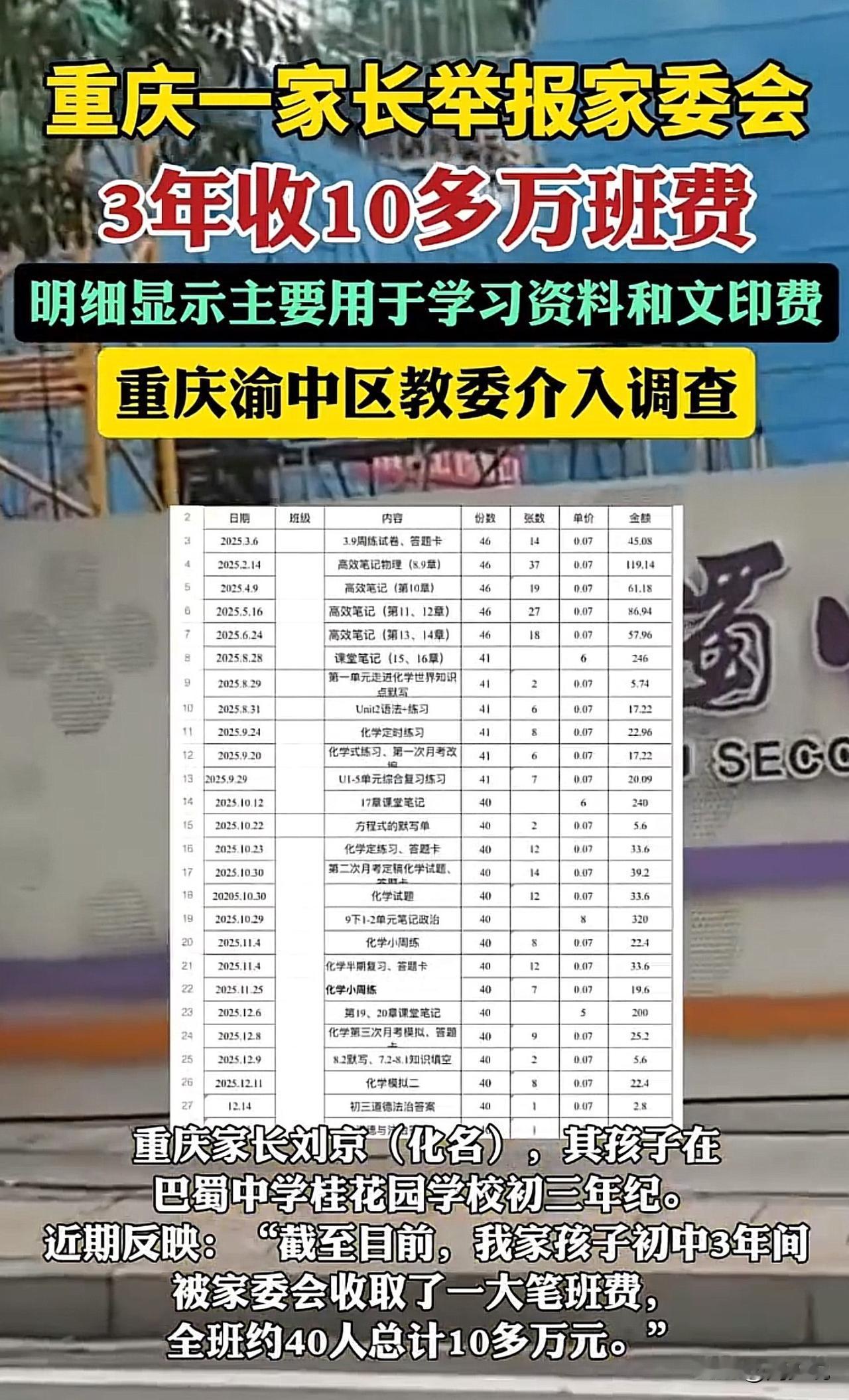#官方介入家委会被举报收10多万班费#“难以置信!”看到一则新闻,重庆一家长举报,孩子初中3年被家委会收取班费总计10多万元,全班40人左右,自己家庭困难,这般收费实在难以承受。 据悉,家委会多年来分次收费,常以“费用超支”为由催缴,仅2025年12月至2026年1月就两次各收500元,费用多花在复习资料等方面。班主任否认收费数额,称班费由家委会自愿收取、公开透明,自己并未过问。目前,渝中区教委已表示会介入调查。 此事曝光后,网友纷纷留言:“义务教育阶段收这么多,确实不合理”! 也有网友说:“家委会收费该有个标准,不能想收就收”! 还有网友更是直言:“公开透明也得有上限,总不能让家长不堪重负”。 看完这事,周少想说家委会收取班费本是为了方便班级事务,但若缺乏合理管控,很容易变味。义务教育的初衷是减轻家庭负担,而非通过班费增加压力。家委会的行为,或许出发点是好的,但忽略了不同家庭的经济差异。 实际上,班费收取不仅需要公开透明,更得有明确的标准和上限,还要充分考虑家长的承受能力,不能搞“一刀切”。 相关部门的介入调查,正是为了规范这类行为,让家委会真正发挥积极作用。 这也给所有学校和家委会提了个醒:服务班级的同时,更要守住合理合规的底线,兼顾公平与体谅,这样才能赢得家长的认可。#寻美三湘#