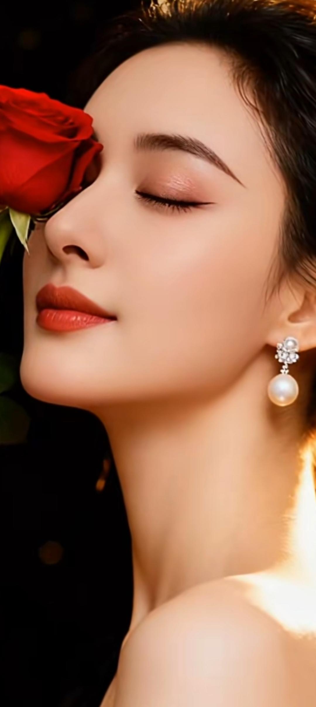 优雅红玫瑰,温柔闭眼妆,珍珠耳环闪耀,尽显女性魅力。