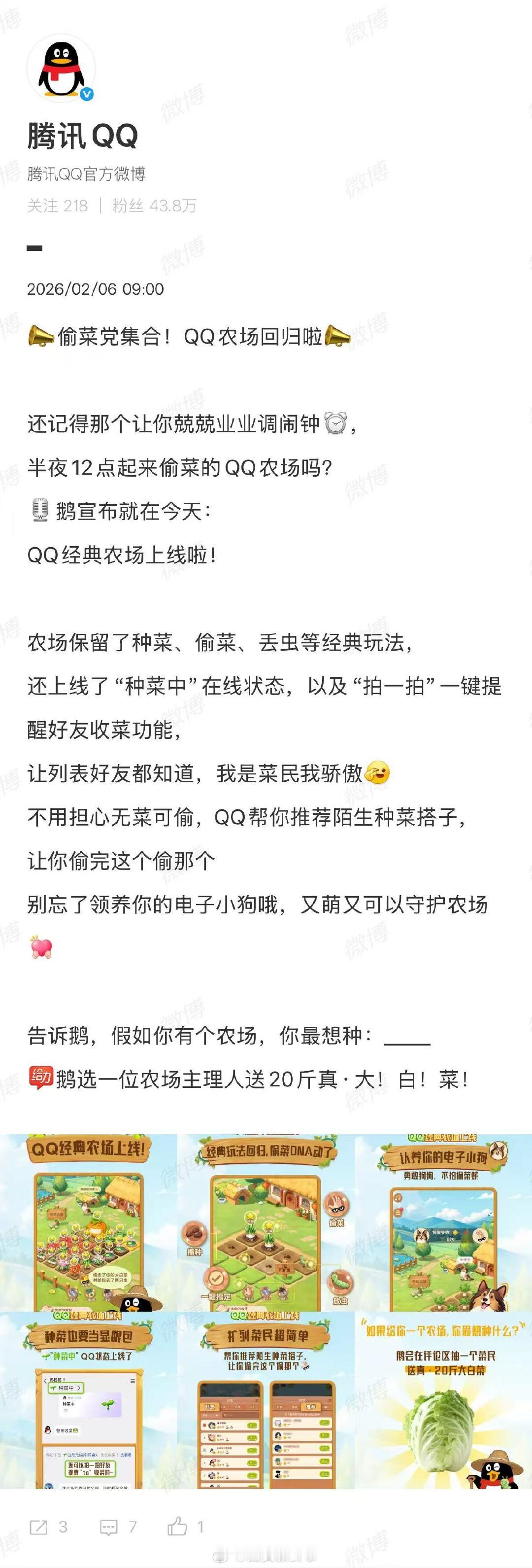 【QQ农场上线种菜中在线状态】QQ农场上线拍一拍提醒收菜功能2月6日,发博宣布:QQ经典农场现已上线,农场保留了种菜、偷菜、丢虫等经典玩法,还上线了“种菜中”在线状态,以及“拍一拍”一键提醒好友收菜功能。