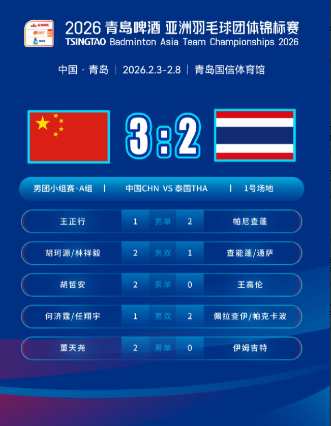 在山东青岛进行的2026年亚洲羽毛球团体锦标赛男团小组赛中,国羽大比分3-2战胜泰国队,小组赛两战两胜晋级八强。 当天的比赛,国羽赢得并不轻松,打满五局才以3-2苦战过关。 首场男单项目,国羽小将王正行鏖战三局21-19、19-21、18-21遭泰国选手帕尼查蓬逆转。 第二场男双项目,年轻组合胡珂源/林祥毅21-19、18-21、21-13战胜泰国组合查能蓬/通萨,帮助国羽扳平比分。 第三场男单项目,浙江小将胡哲安21-9、21-13战胜泰国老将王高伦,帮助国羽反超比分。 第四场男双项目,再次重新搭档的中国组合何济霆/任翔宇18-21、22-20、8-21不敌泰国组合佩拉差伊/帕克卡波,比分打成2-2。 关键的第五场比赛,中国选手董天尧21-4、21-11轻松战胜泰国选手伊姆吉特,帮助国羽锁定胜局。 以A组头名晋级八强后,根据最新抽签结果,四分之一决赛国羽对手将是中国台北队。