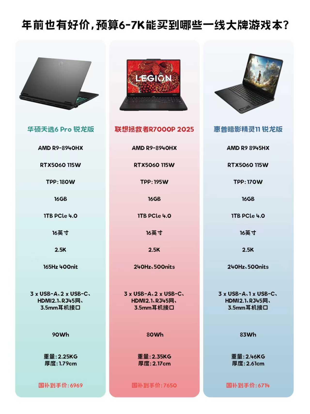 听劝💥现在不买游戏本得后悔一整年 年前还有机会买到好价游戏本吗? 😱有,当然有! 现在国补+一线品牌大促叠buff 6K+就能入手RTX5060的一线大牌游戏本 这价格真的低,而且华硕、联想、惠普随便挑! 关键今年存储涨价,26款新品大概率要提价 现在入手直接省好几百,再犹豫真得拍大腿了! 最近想换游戏本的赶紧冲,现在可能就是今年最好的时机了! - 研究了一圈,这三款还不错,大家对号入座就行👇 ✅ 联想拯救者R7000P 2025(💰7650) 锐龙9+5060有195W满功耗释放,240Hz高刷屏,玩3A大作帧率稳到飞起,而且联想口碑售后好,游戏党可以冲。就是机身不算轻薄,不方便随身携带 👨适合预算稍高、追求极致游戏性能和高帧率的硬核玩家。 ✅ 华硕天选6 Pro锐龙版(💰6969) 同样搭载锐龙9+5060,性能释放达到180W,加上2.25kg轻薄机身+90Wh长续航,图书馆学习、宿舍打游戏都能hold住,兼顾娱乐和生产力。 👨适合需要兼顾学习办公、日常娱乐和游戏的学生党或上班族。 ✅ 惠普暗影精灵11(💰6714) 预算有限可以看看暗影精灵11,一线品牌性价比之王,国补后跌破6K,性能也很硬核,还有240Hz高刷屏,玩3a、网游都更爽~⚠️但要注意它有黑屏前科,买的时候记得仔细验机,避开坑~ 👨适合喜欢预算有限,重视性能的玩家。 🔥一句话总结:纯游戏猛干选拯救者,要颜值便携选天选,追求极致性价比看看暗影精灵 趁大促还在,国补没取消,想换游戏本的别犹豫,现在剁手真的不亏! 游戏本联想华硕天选6 Pro