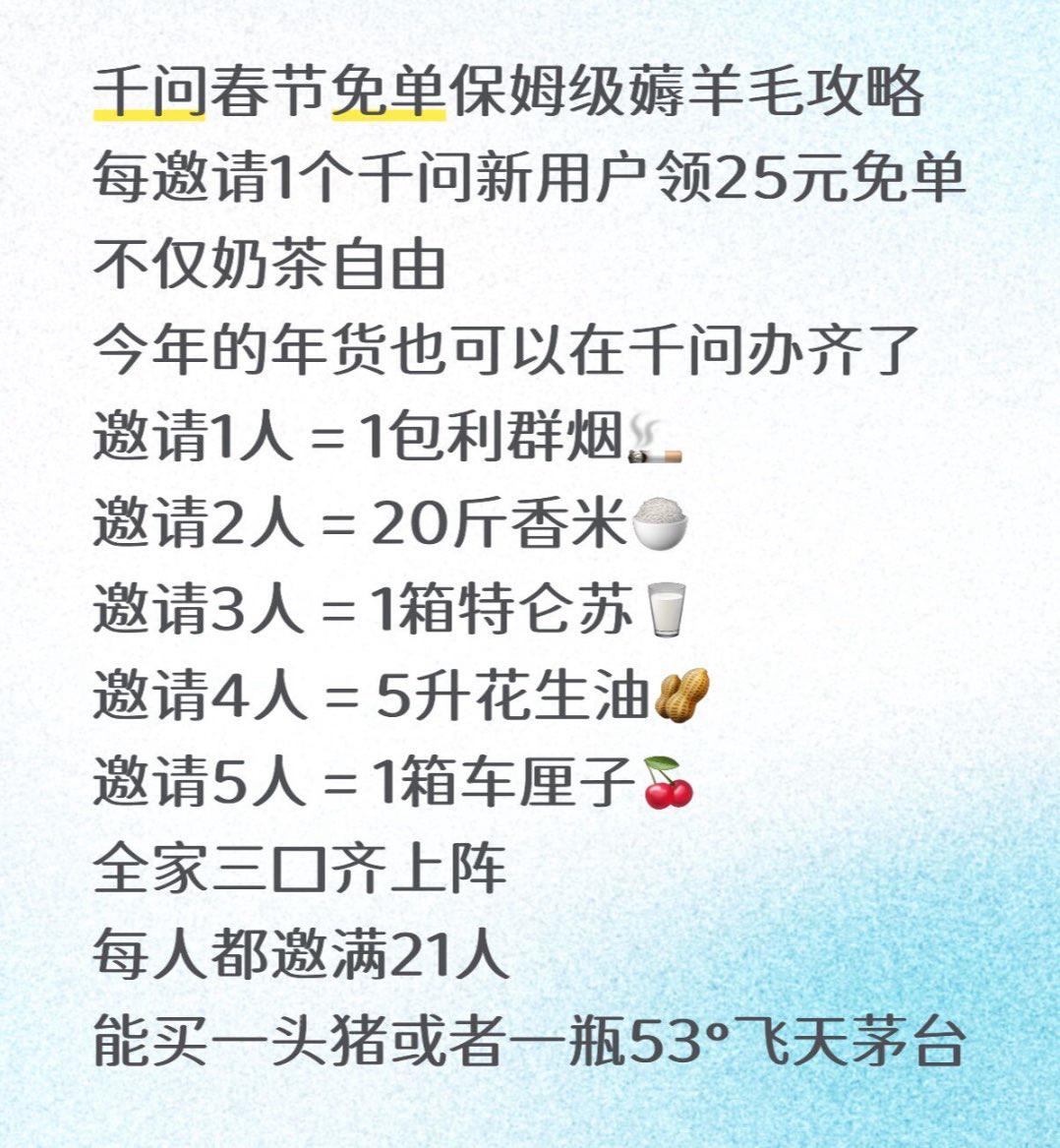 千问 免费奶茶 今天有点emo,本来想喝奶茶治愈一下,结果用千问点单直接省了25块!瞬间被治愈了!这种突然的小快乐必须分享给你们。方法特简单:现在就去下个千问APP,选你最爱的那杯下单就行。如果你也被幸运砸中,评论,并把下单截图发我,我再随机挑选5位,每人25元请你吃个小甜品,快乐加倍!