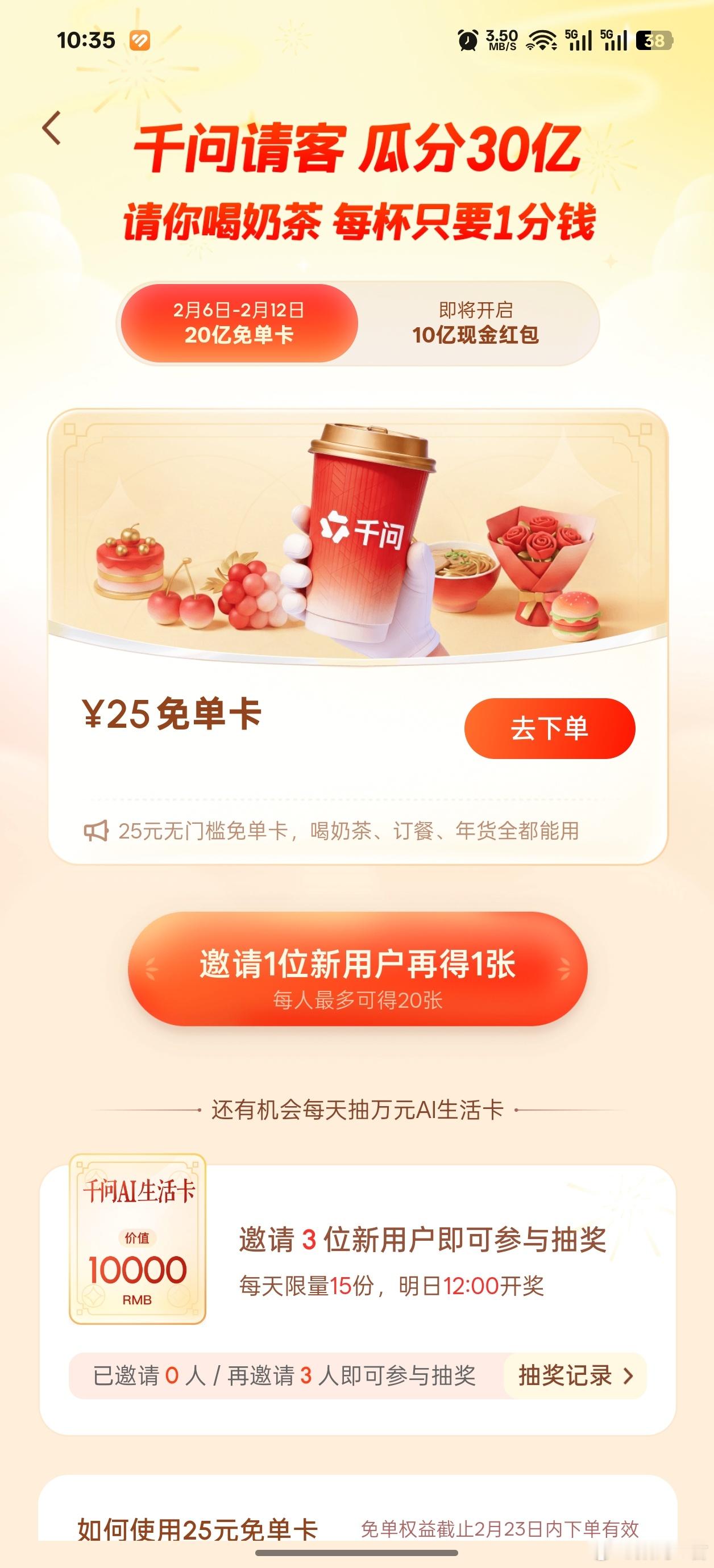 千问 免费奶茶AI时代的推广真是一个比一个狠呐!千问上来就先给每人发一张25元免单卡…我刚试,好像有点崩,你们顺利喝上了吗?