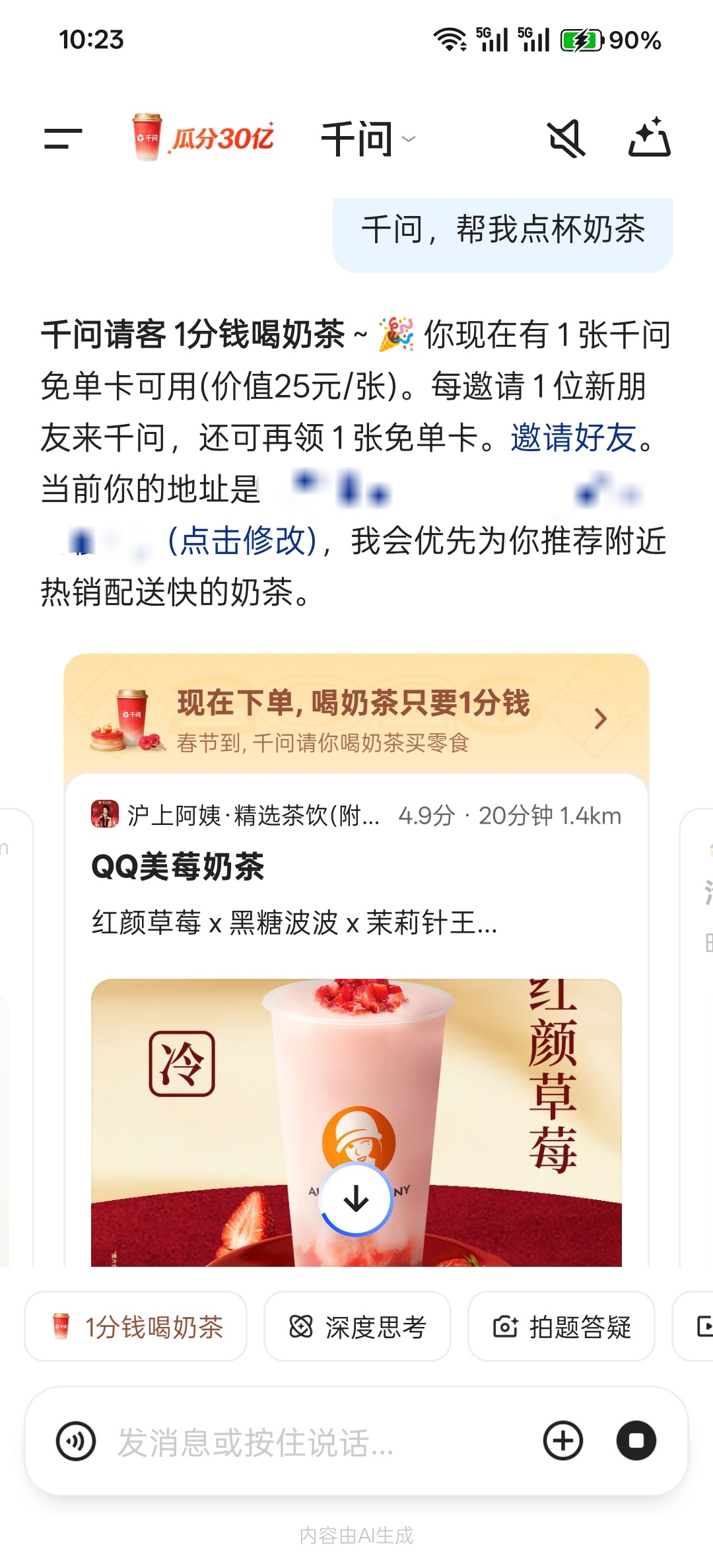 诶哟喂,千问也来争夺资源来了,继元宝派哗哗给用户发红包之后,阿里通义万相千问AI也来发红包了,直接在千问AI说,千问,帮我点杯奶茶,送25元券,饮料🥤全场1分钱喝了,点一杯上海阿姨尝尝 元宝派千问