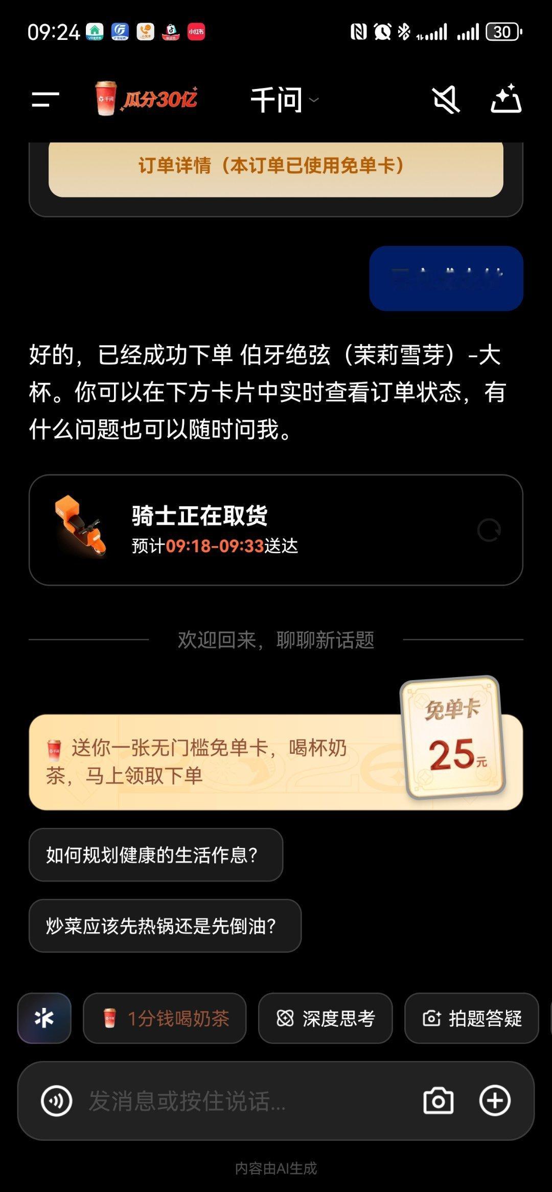 太壕横了,春节30亿大免单己经开始了,关键一点就是直接语音就可以把奶茶点回家,我已经为大家提前体验到了这个便捷了。千问 免费奶茶
