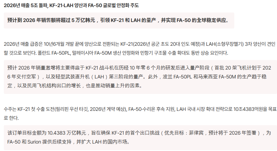 韩国航空航天工业公司(KAI)表示,他们正准备确保KF-21“猎鹰”战斗机的首份出口合同,优先目标客户是菲律宾,预计将于2026年签订合同,其竞争对手是瑞典“鹰狮E/F”每天认识一件兵器烽火问鼎计划 KAI预计 2026 年营收突破 5 万亿韩元(约 36 亿美元)。✈️ KF-21:转入量产,韩国空军首批接收约 20 架🚁 LAH 小型武装直升机:进入第 3 批量产🛩️ FA-50:波兰 FA-50PL、马来西亚 FA-50M 生产稳定,菲律宾的后勤与升级支撑成为新增长点📦 订单目标:10.4 万亿韩元,约 75 亿美元规模