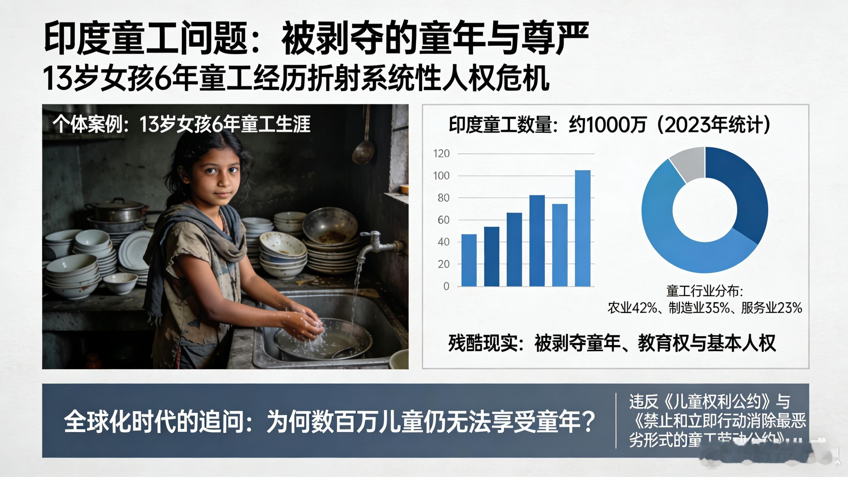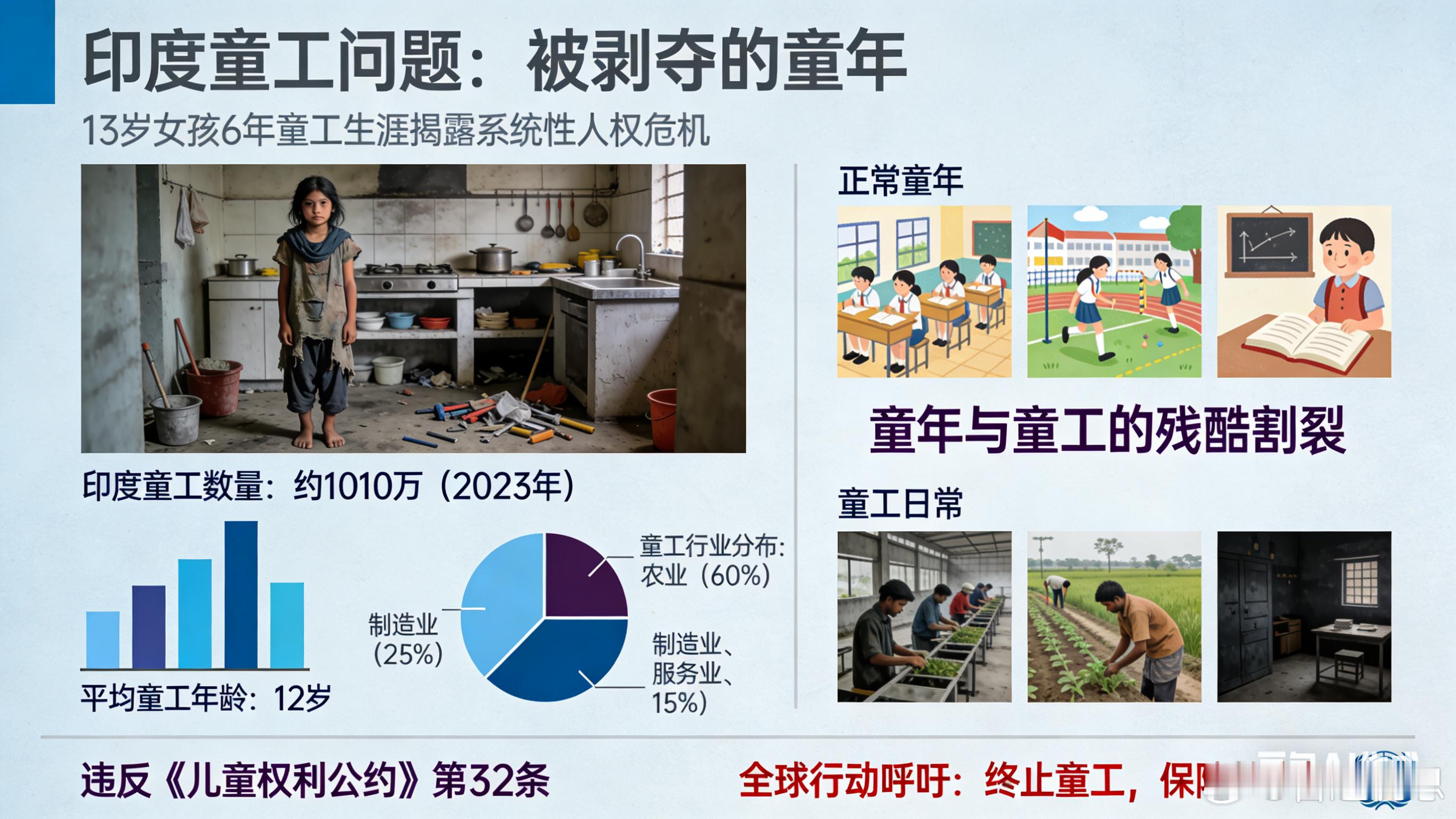 印度13岁女孩在一户家庭当6年童工震惊!印度童工问题持续恶化,一个13岁女孩竟然在别人家做了整整6年童工!这不仅仅是简单的帮工,而是被剥夺童年、教育权和基本人权的残酷现实。据统计,印度仍有数百万儿童被迫从事各种劳动,他们的童年被无情剥夺。这种现象不仅违反了国际公约,更是对人类基本尊严的践踏。我们必须反思:在全球化的今天,为什么还有这么多孩子无法享受应有的童年?