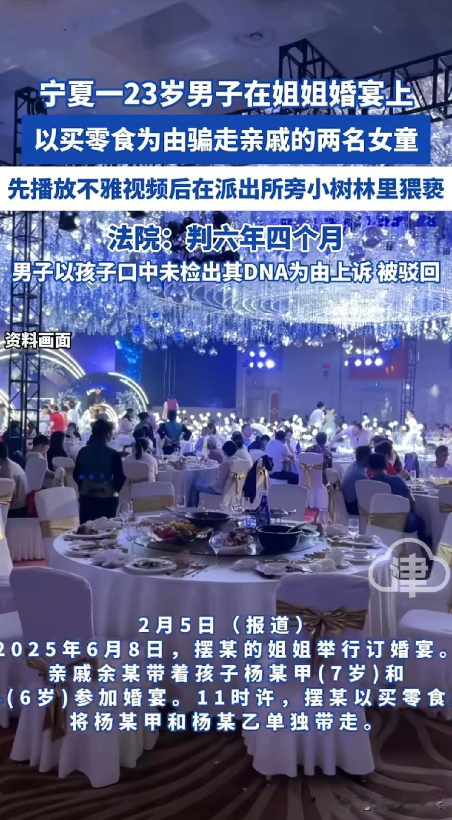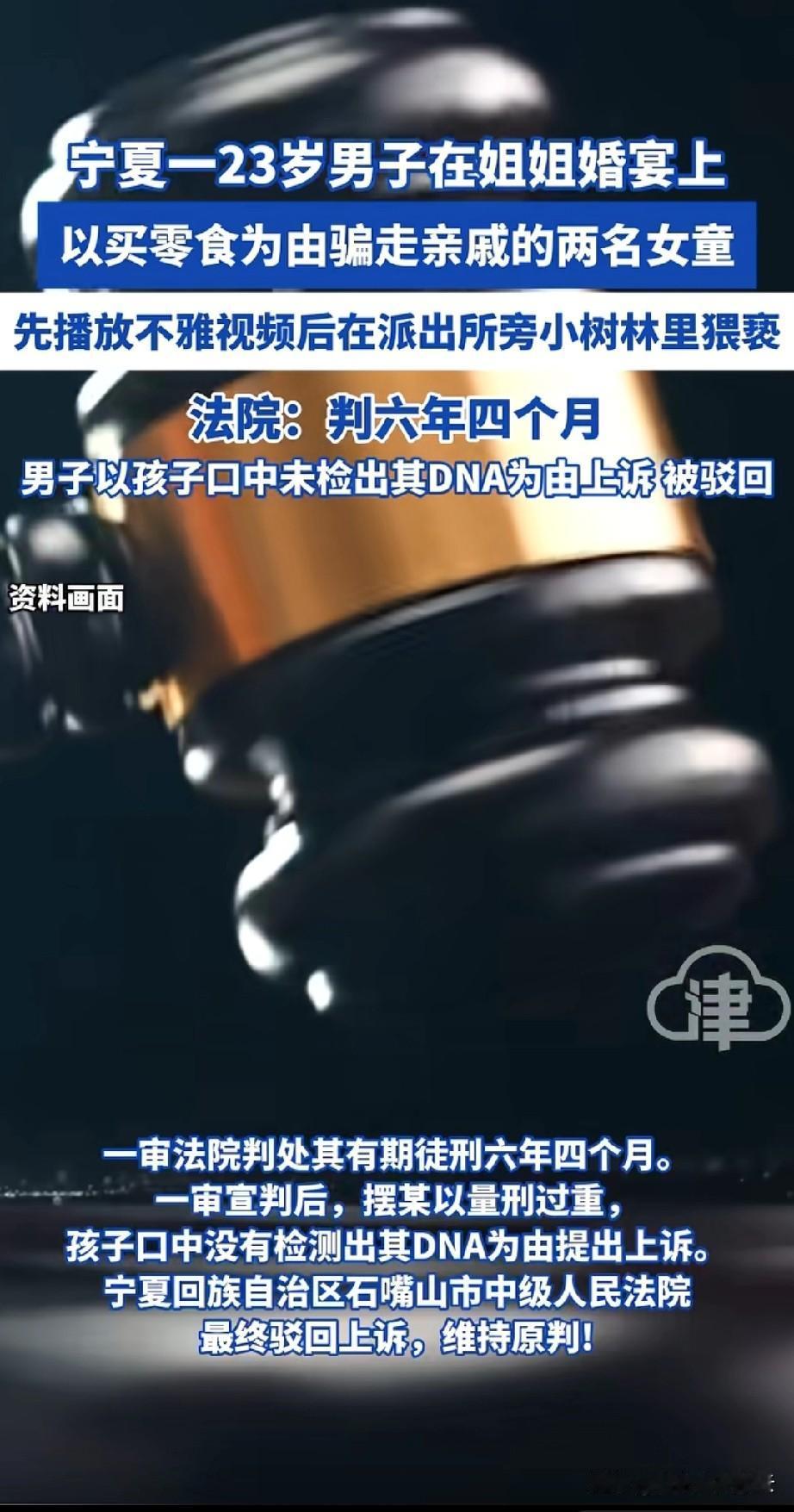 判的好!一男子在姐姐的婚宴上,以买零食为由偷偷带走了两个女孩。这两个女孩,一个7岁,一个6岁。 男子先是把她们带到一个凉亭里,给她们观看不雅视频,然后把她们带到偏僻的小树林里,他支开那个6岁的女孩,对稍大一点的女孩进行了猥亵。 女孩回去后,一直在吐口水,引起了女孩妈妈的怀疑,知道原委后,女孩家人愤怒不已,两边发生冲突。女孩妈妈报警。 男子被判了六年零四个月,他觉得判的太重了,他提起上诉,上诉的理由是没能从女孩口中检测出他的DNA,不过上诉被驳回了。 有网友说,真丢人啊!在姐姐婚礼上干这种事,父母估计都要被气死了,他们以后怎么在亲戚面前抬得起头? 有网友说,不光是害了两个女孩,亲戚也都知道了,他也害了自己的姐姐。姐姐以后在婆家还有尊严吗? 我觉得男子能在自己亲姐姐婚礼上做这种事,就没有考虑过姐姐的处境。姐姐以后还是少跟他联系吧,这种人只想着自己。 对于这件事,你怎么看呢?