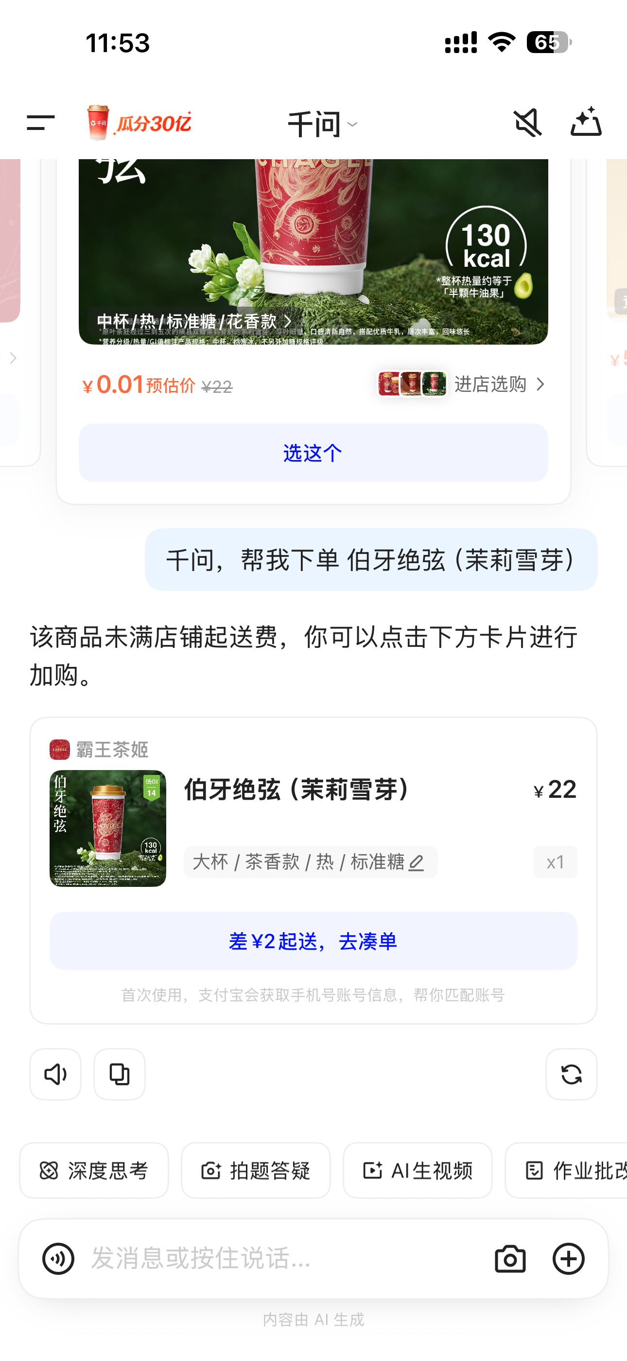 千问 免费奶茶是可以免费喝,但是我家附近的霸王在淘宝闪购app下单,每次都是差2块,让凑单,绝了 冒个泡