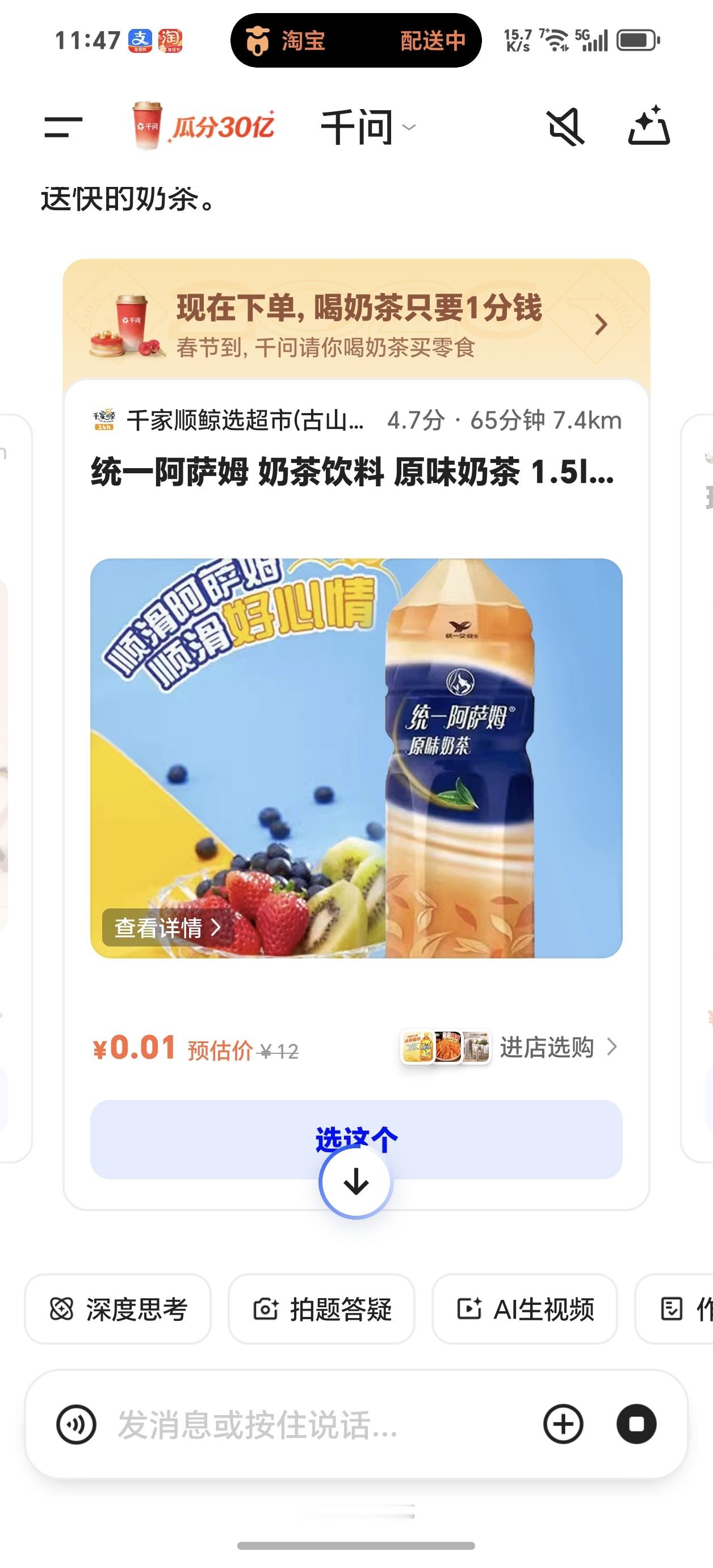 千问免费奶茶我家附近没有点得到的,都是超市的一些香飘飘刚刚特意用淘宝闪购看了看