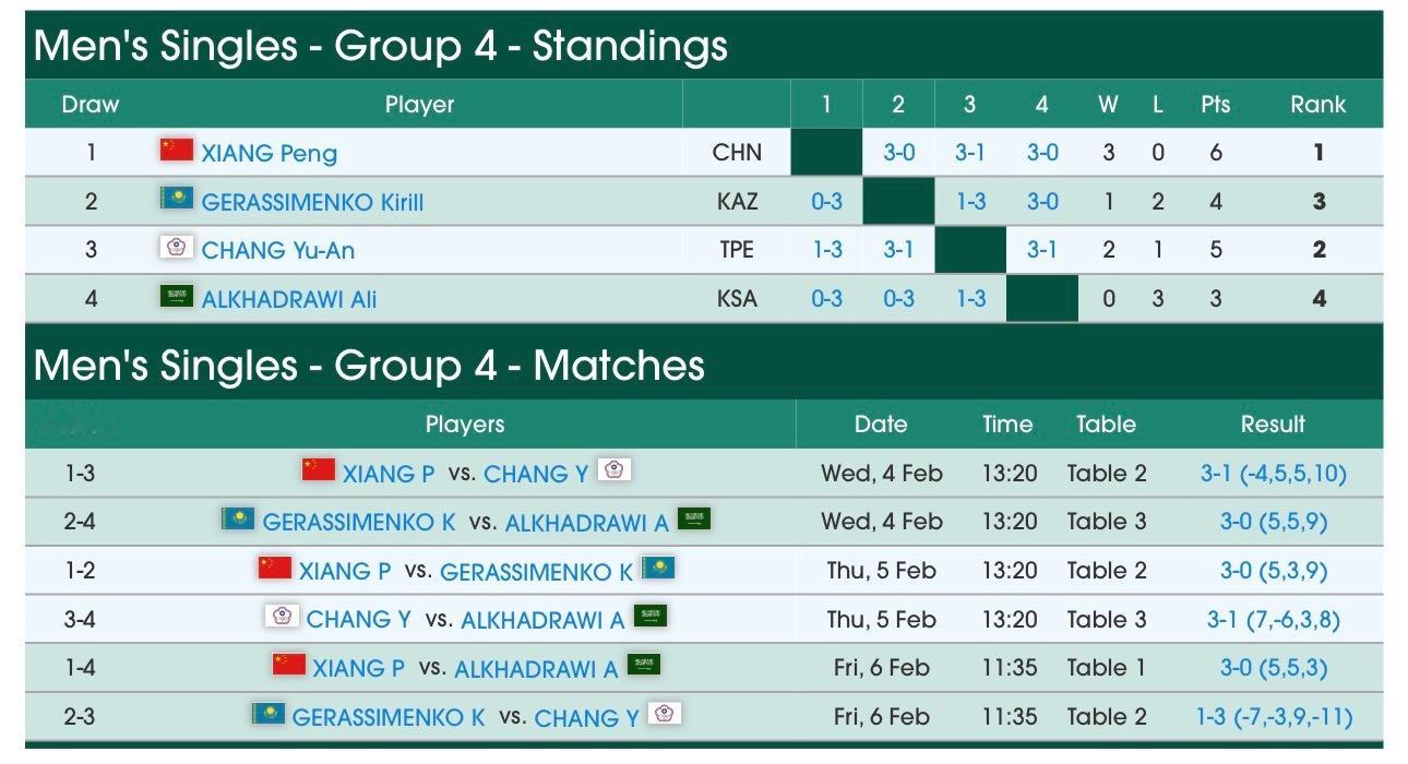 海口亚洲杯男单小组赛第三轮向鹏3比0阿尔哈德拉维(11-5,11-5,11-3)向鹏晋级第二阶段,将作为淘汰赛4号种子